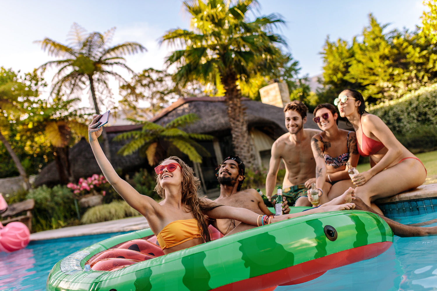 Girl with friends taking selfie in the swimming pool. Group of young people enjoying summer in swimming pool and taking selfie.