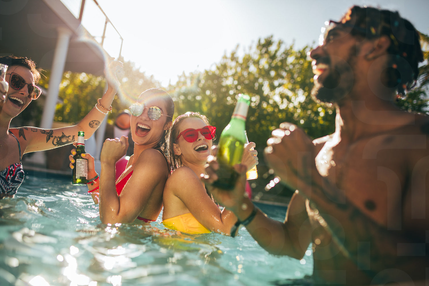Group of happy friends at pool party with beers. Men and women people laughing and having fun inside swimming pool.