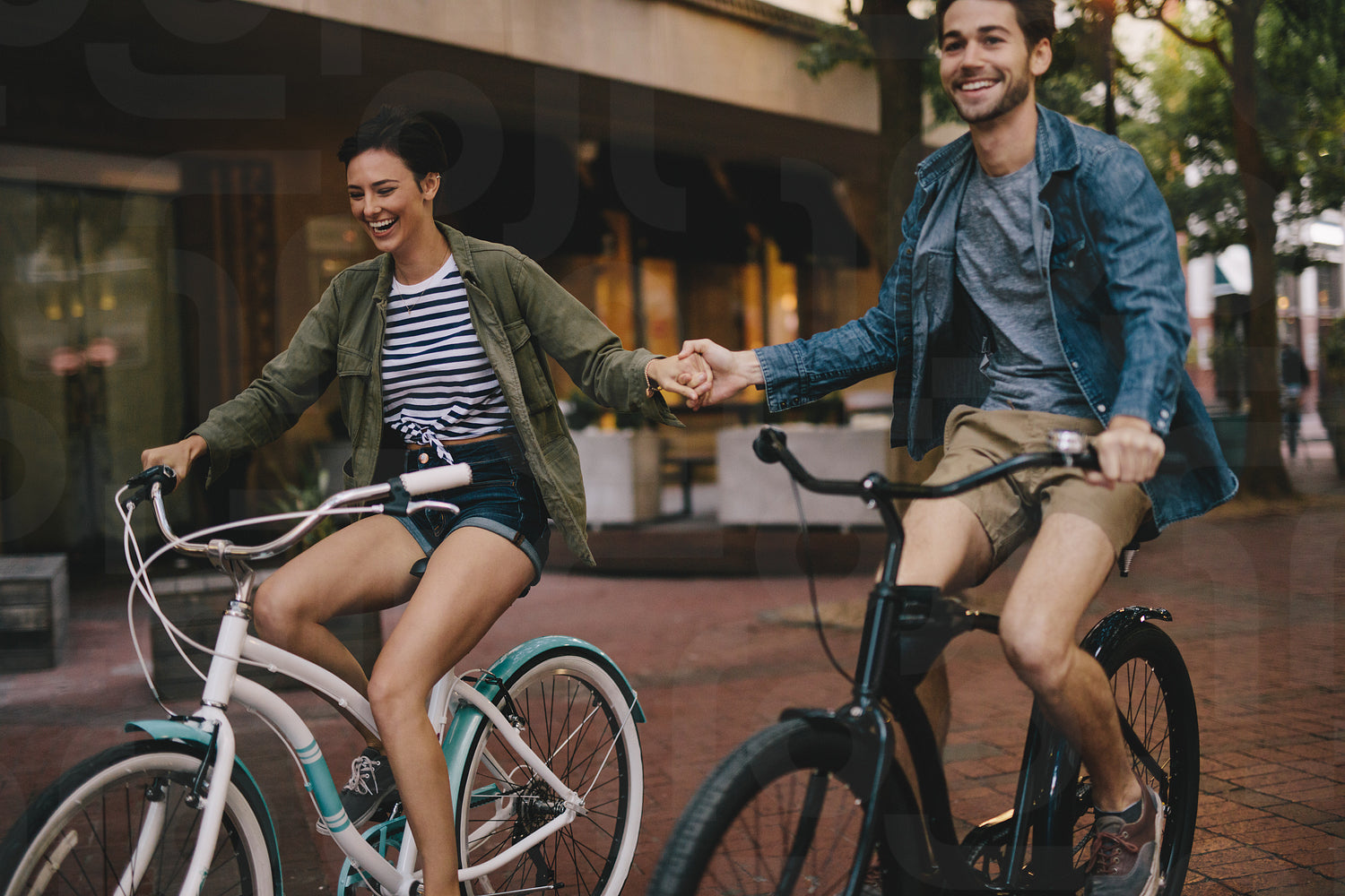 Happy young couple holding hands and riding on bikes. Smiling man and woman cycling together in the city.