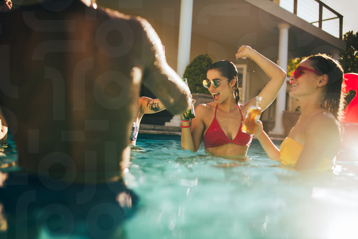 Happy friends making party inside pool. Young people swimming and drinking beers at swimming pool party.
