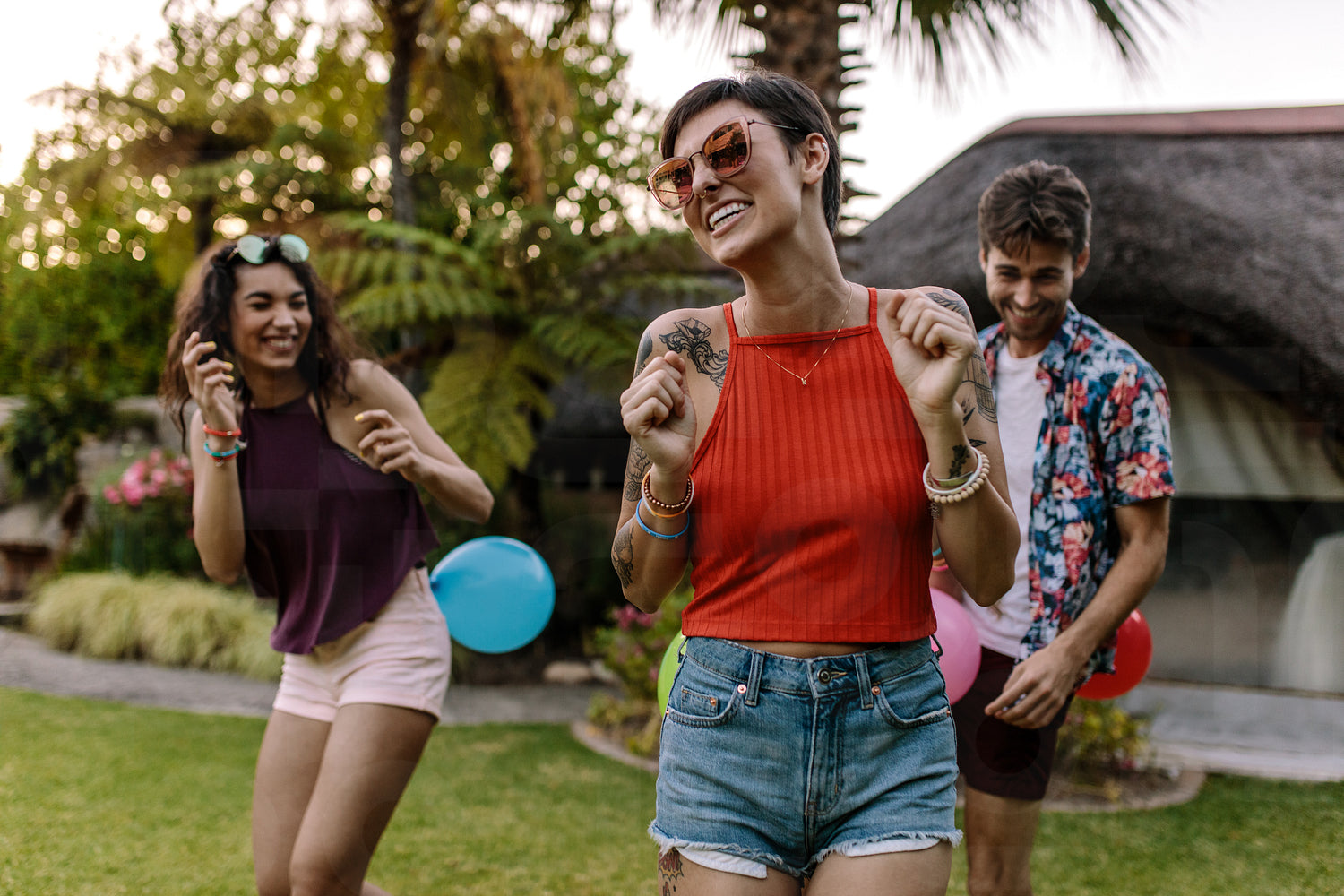 People playing balloon popping game at party. Men and women trying to burst each others balloons.