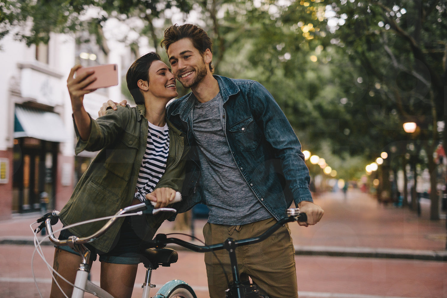 Romantic couple with bicycles taking selfie. Women taking selfie and kissing her boyfriends cheek.
