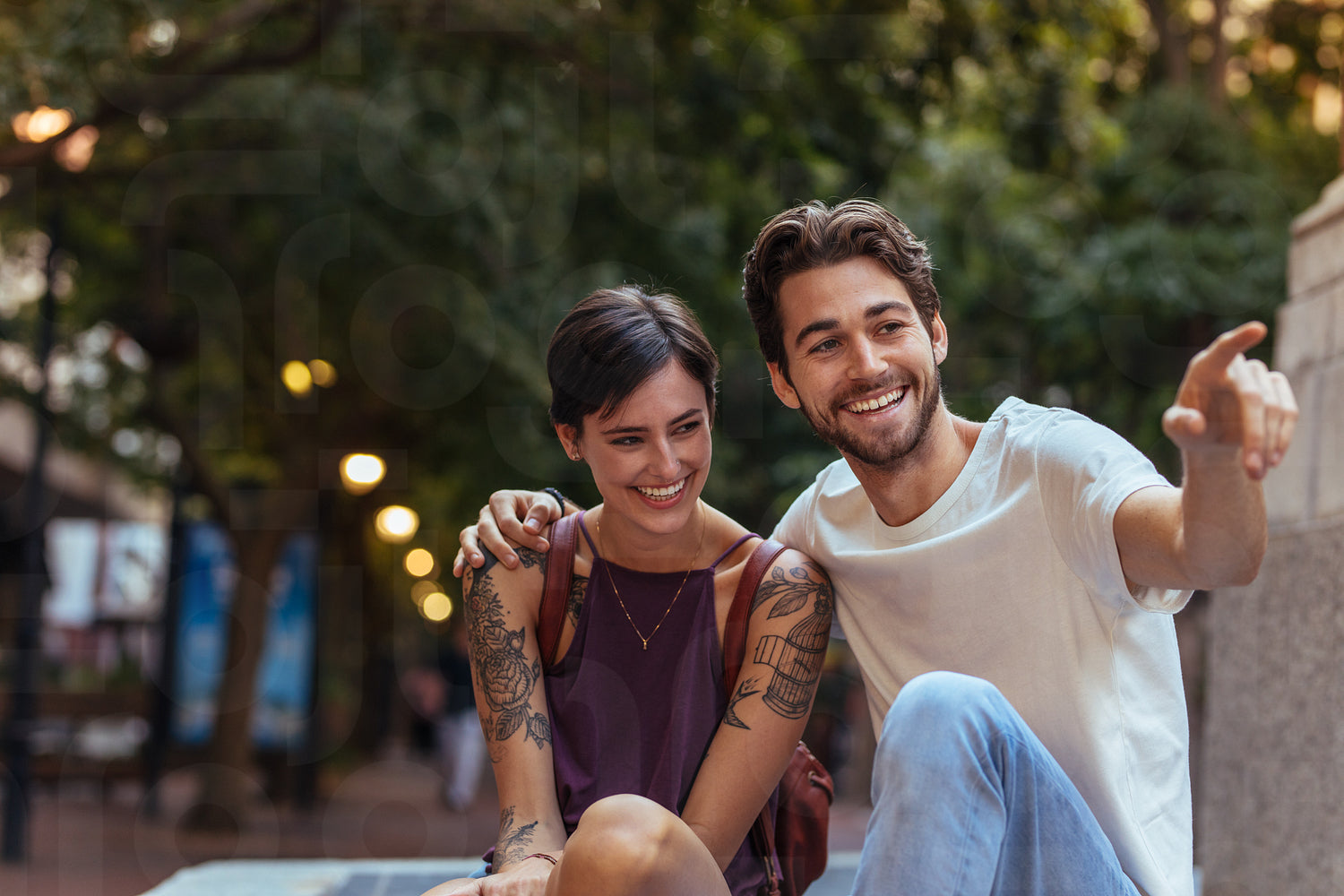 Happy explorer couple sitting outdoors and talking. Man talking to woman with his arm around her shoulders and pointing towards an object.