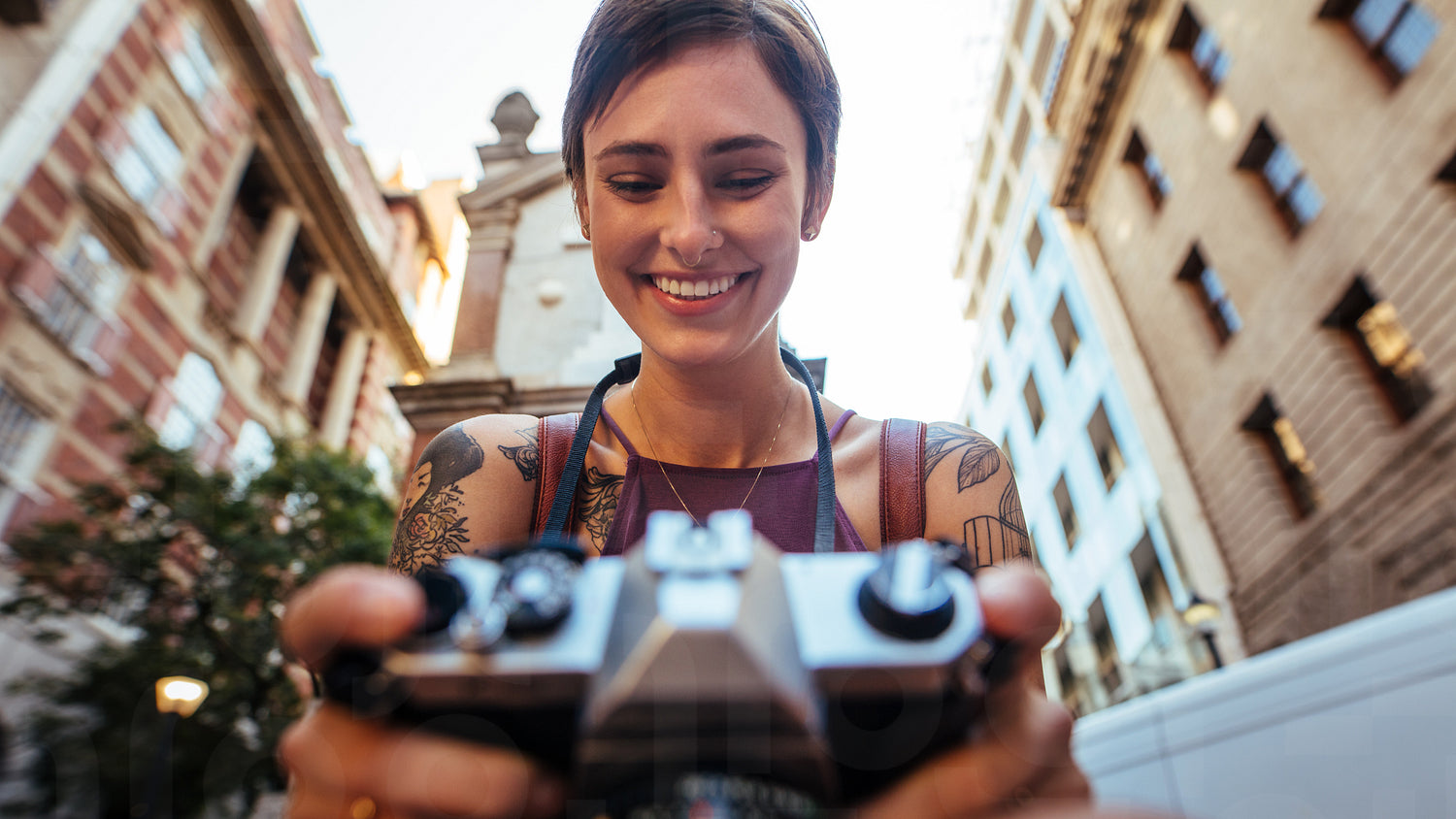 Close up of a smiling woman tourist taking photograph using a camera. Low angle shot of a woman taking photo outdoors with buildings in the background.