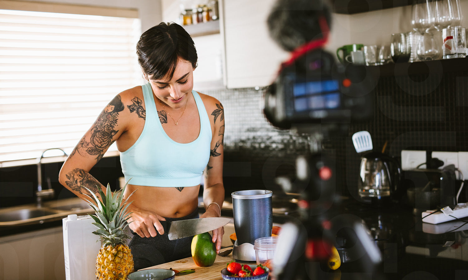 Tattooed young woman cutting fruits on kitchen counter and recording video on camera. Social media influencer in kitchen making smoothies and recording content for her video blog.