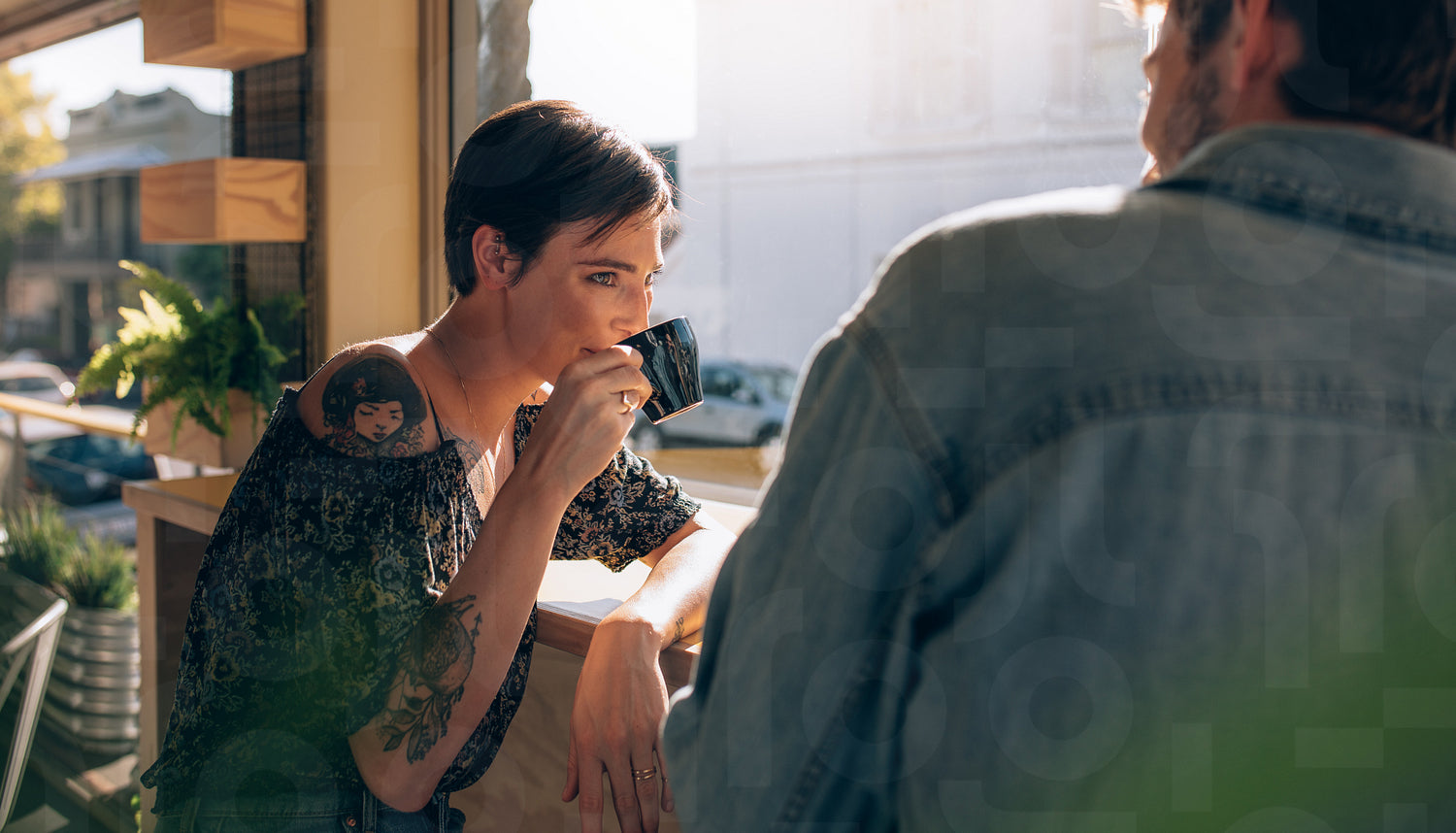 Woman drinking coffee sitting at coffee shop with her male friend. Couple having a cup of coffee at restaurant.