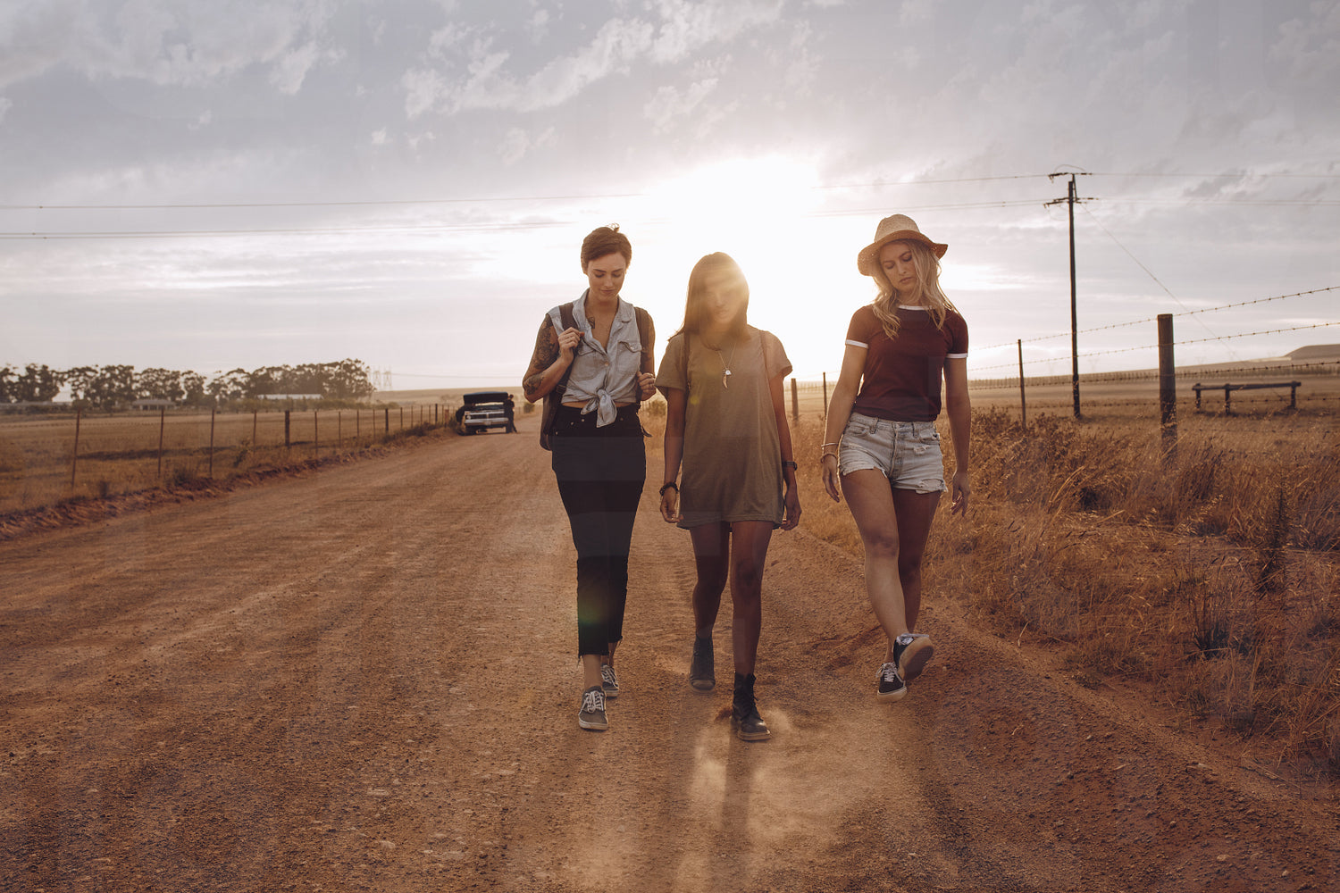 Full length of three disappointed women walking through country road leaving their broken down car behind. Friends leaving broken down car behind on country road. They were going on road trip in countryside.