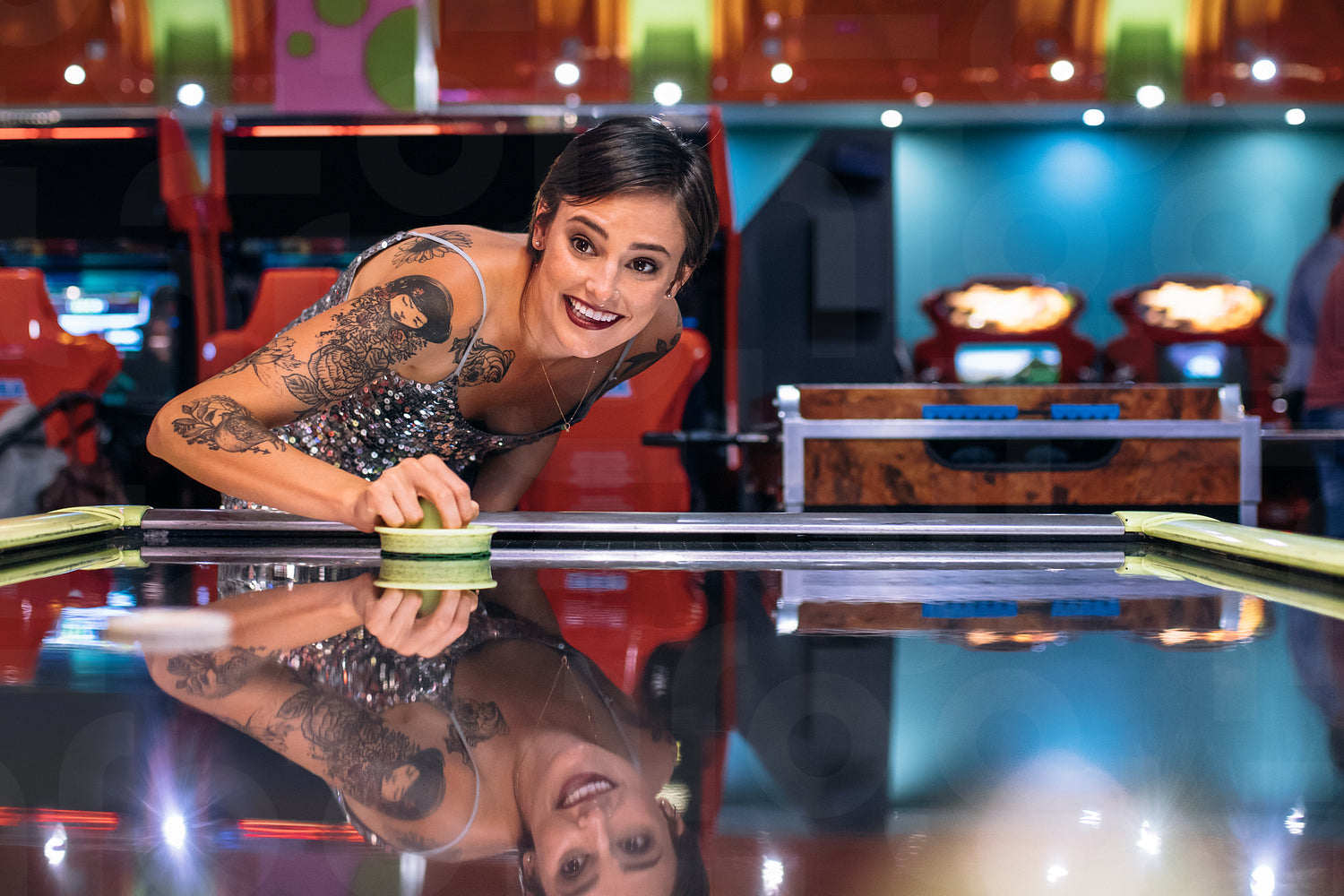 Smiling woman at a gaming arcade playing coin operated air hockey game. Woman having fun playing the air hockey game at a gaming parlour.