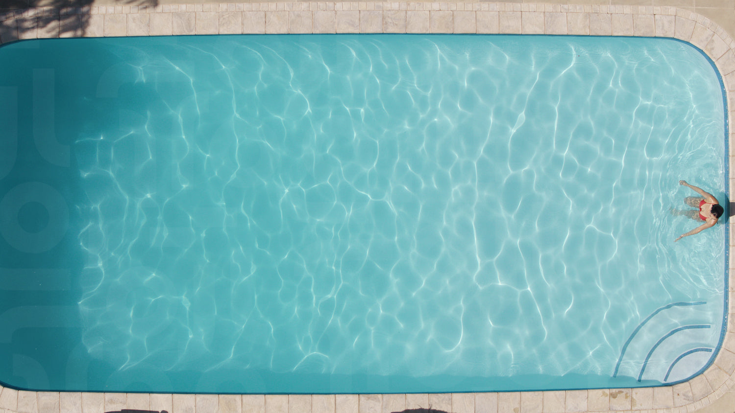Aerial view of woman swimming in the resort pool. Top view of female in red bikini swimming underwater across a pool.
