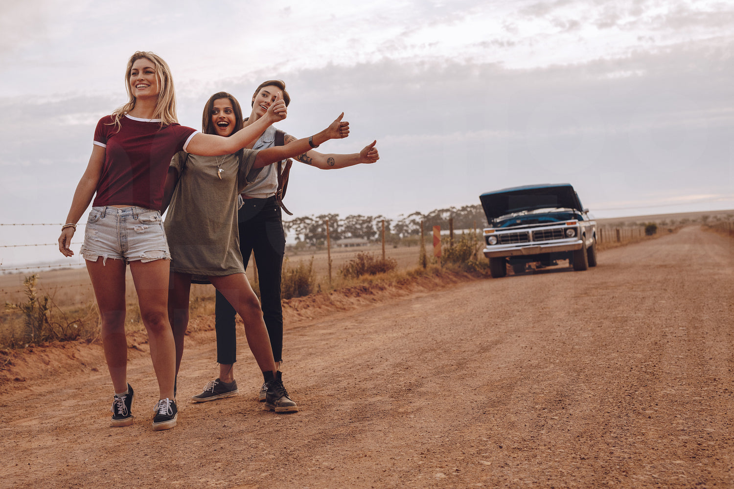 Three young women hitchhiking near their broken car on country road. Smiling female friends gesturing for a lift on rural road with broken down car in background.