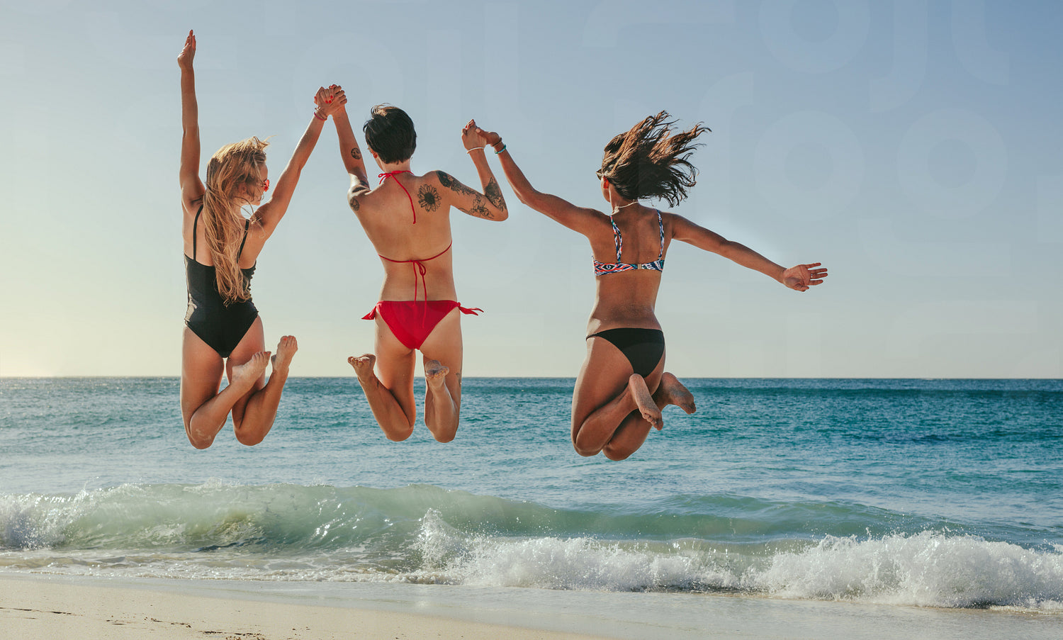 Rear view of three women in bikini jumping high holding their hands and having fun on the beach. Women on vacation enjoying at beach jumping in air facing the sea.
