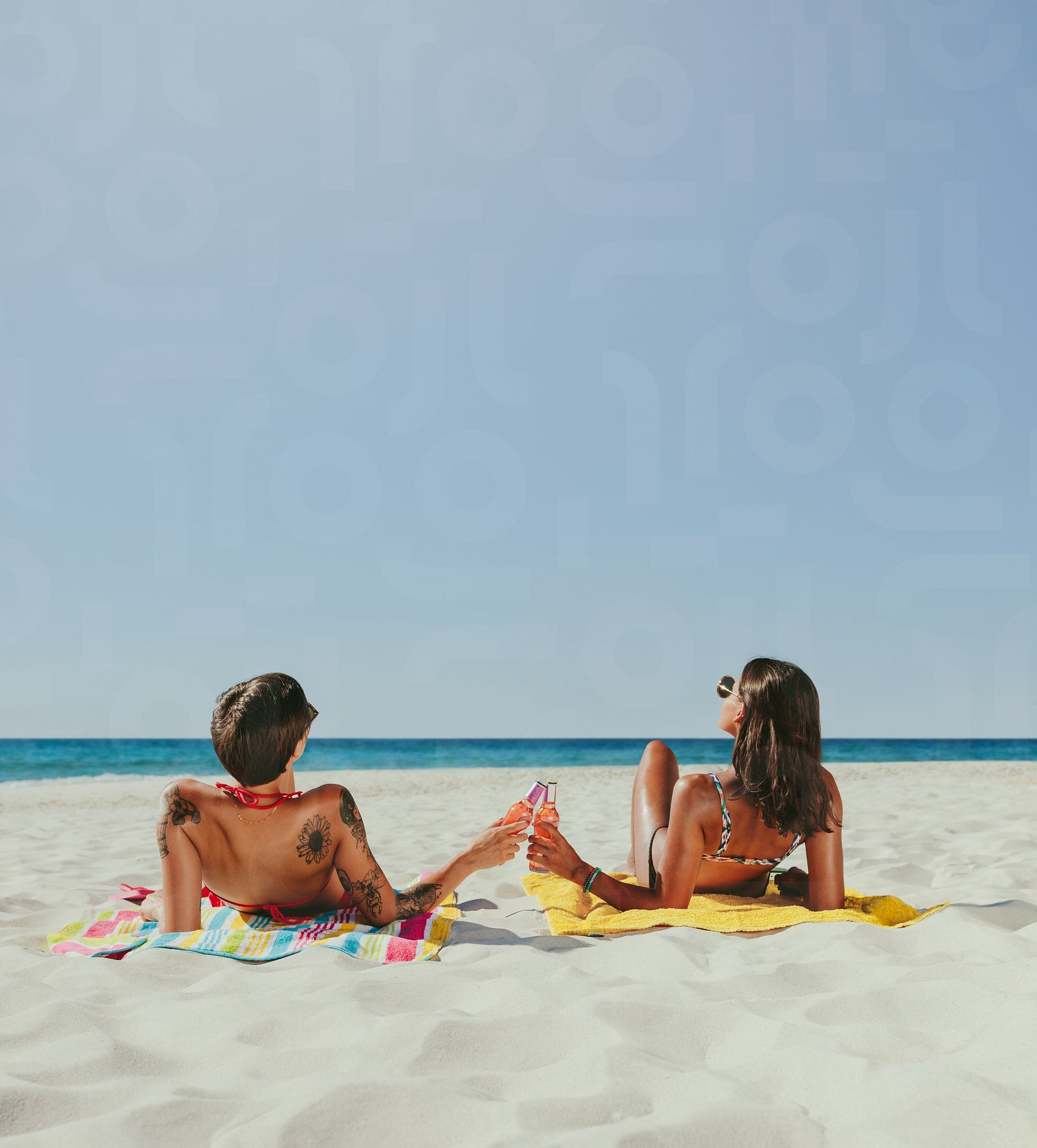 Rear view of two girlfriends sitting on beach in bikini sunbathing and toasting their drinks. Women relaxing on beach facing the sea with drinks in hand on a sunny day.