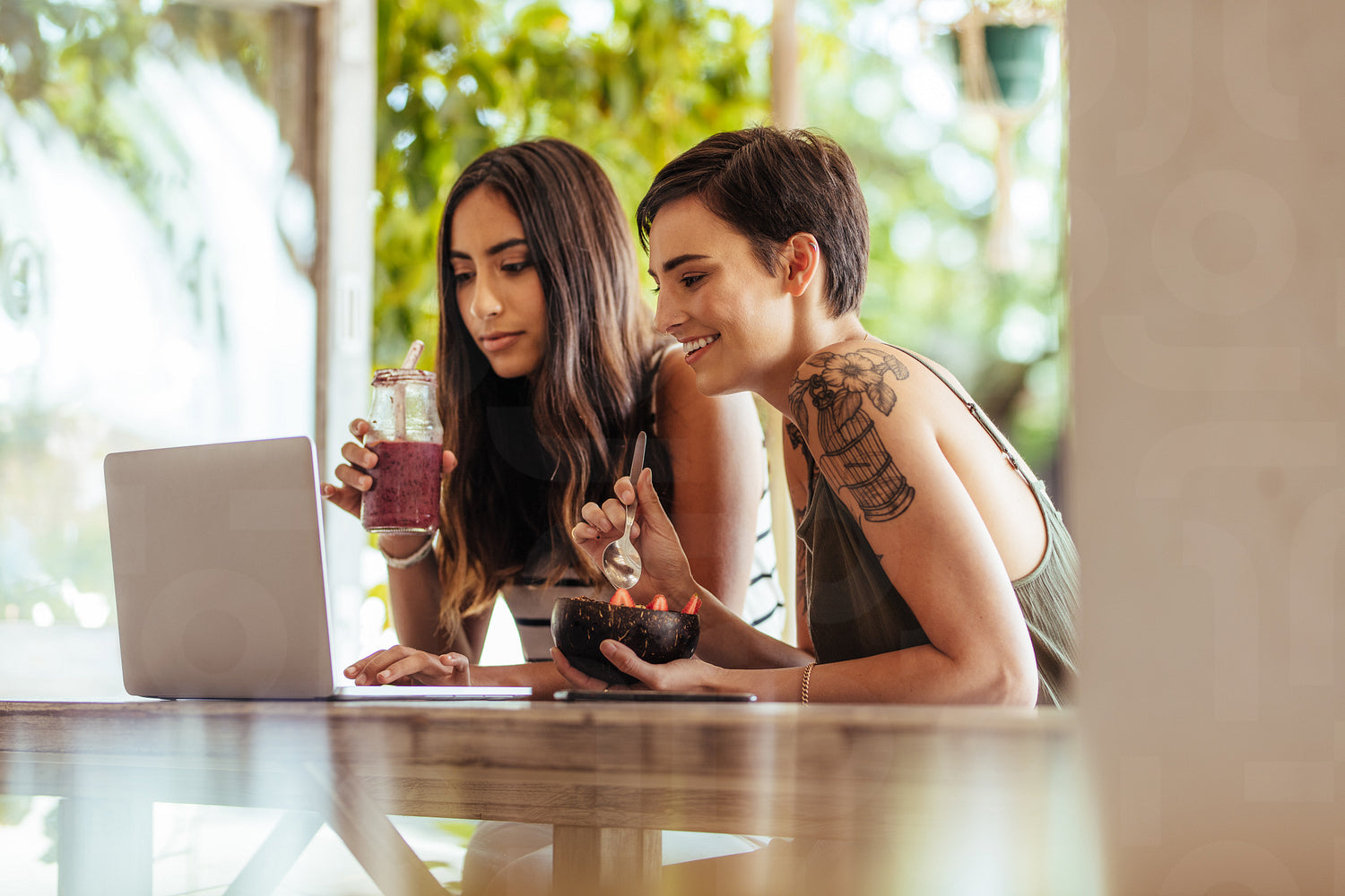 Two women sitting at a restaurant working on a laptop computer. Women sitting at a restaurant enjoying smoothie and a dessert.