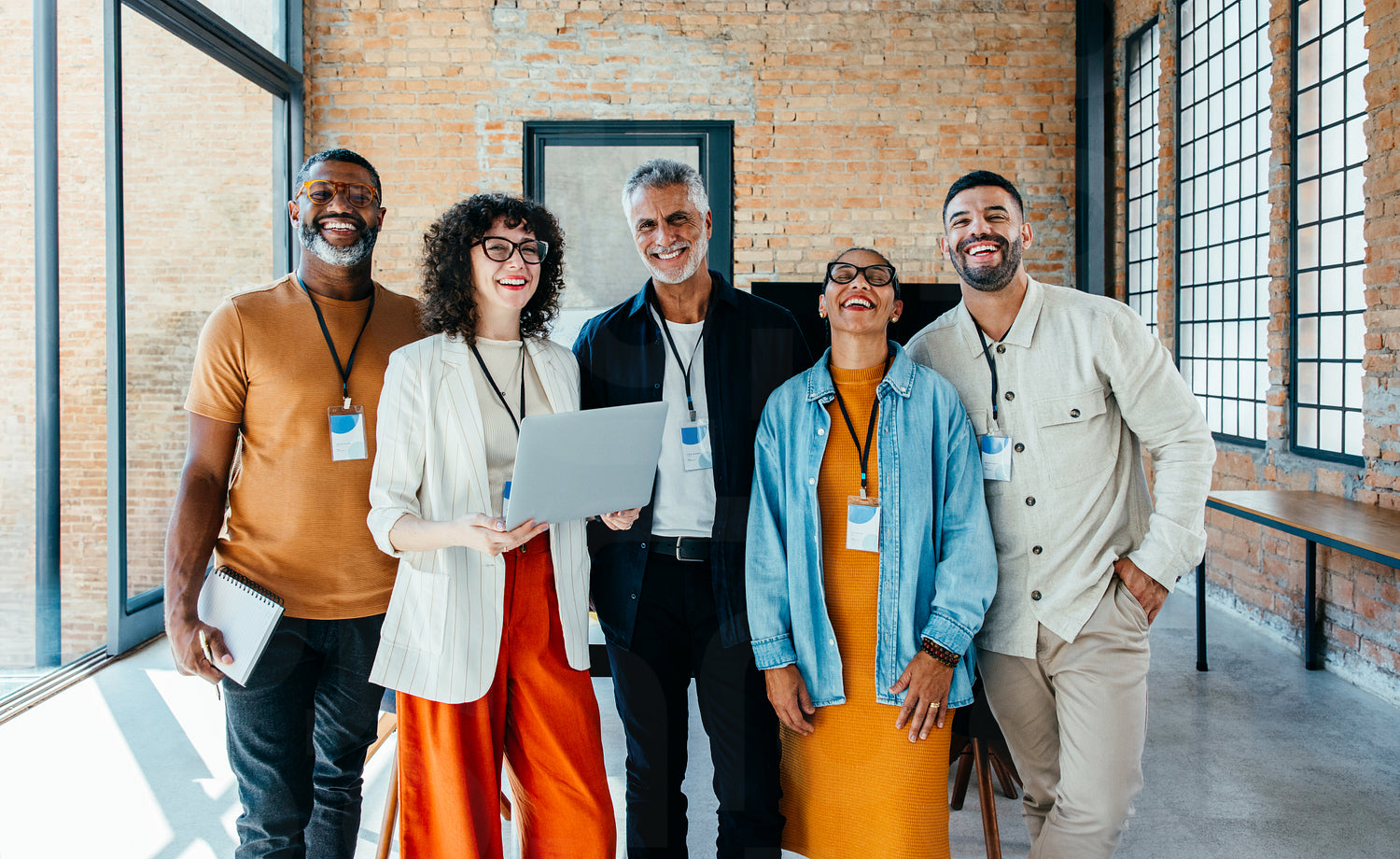 Stylish group of professionals stand smiling together in an office environment