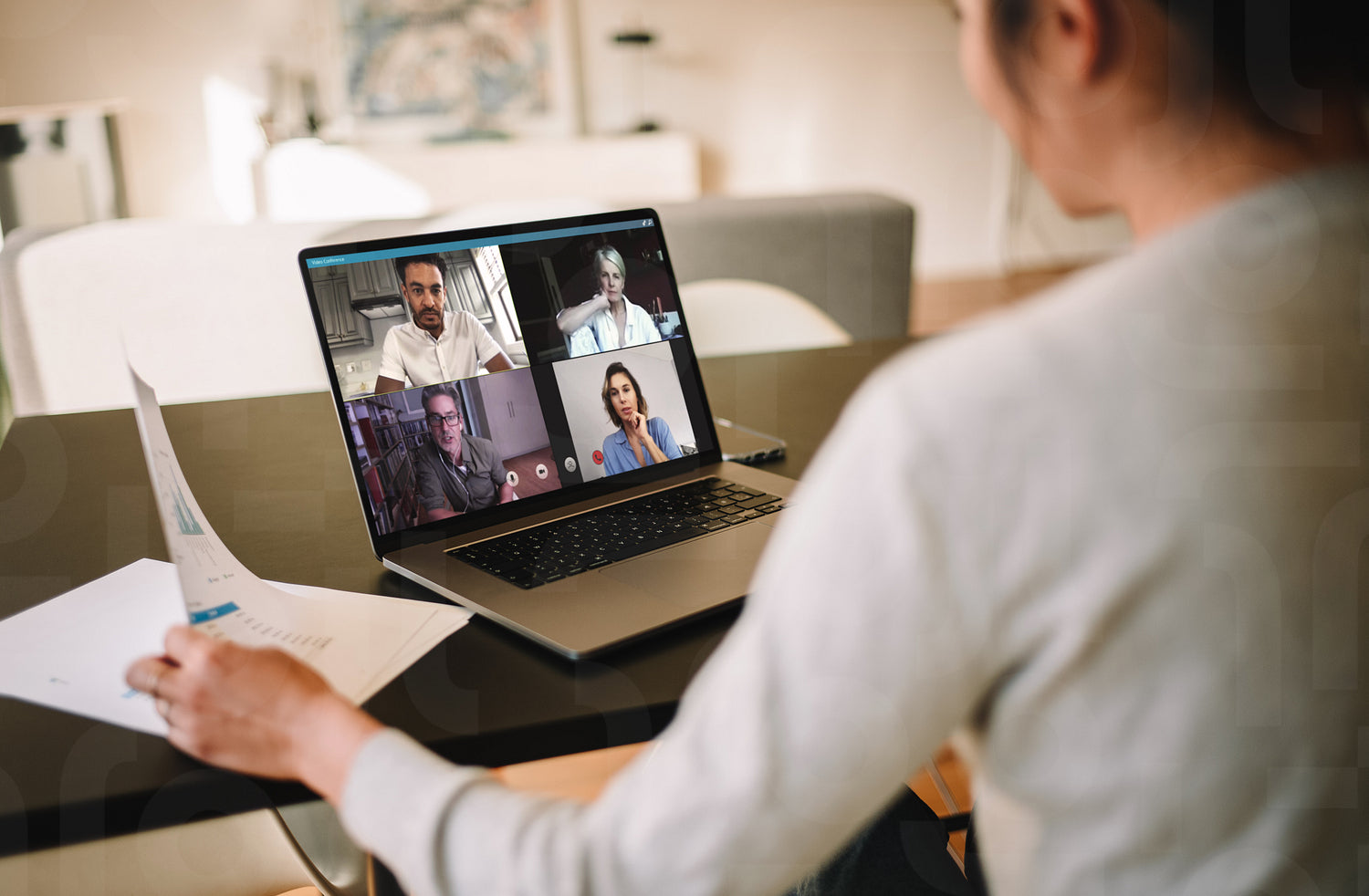 Group of business people working from home, having video conference. Businesswoman having a video call with her team over a laptop at home.