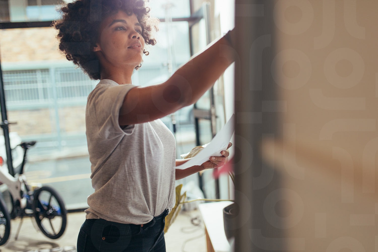 Businesswoman writing on whiteboard at meeting. Young african female working at tech startup writing new project plan on board.
