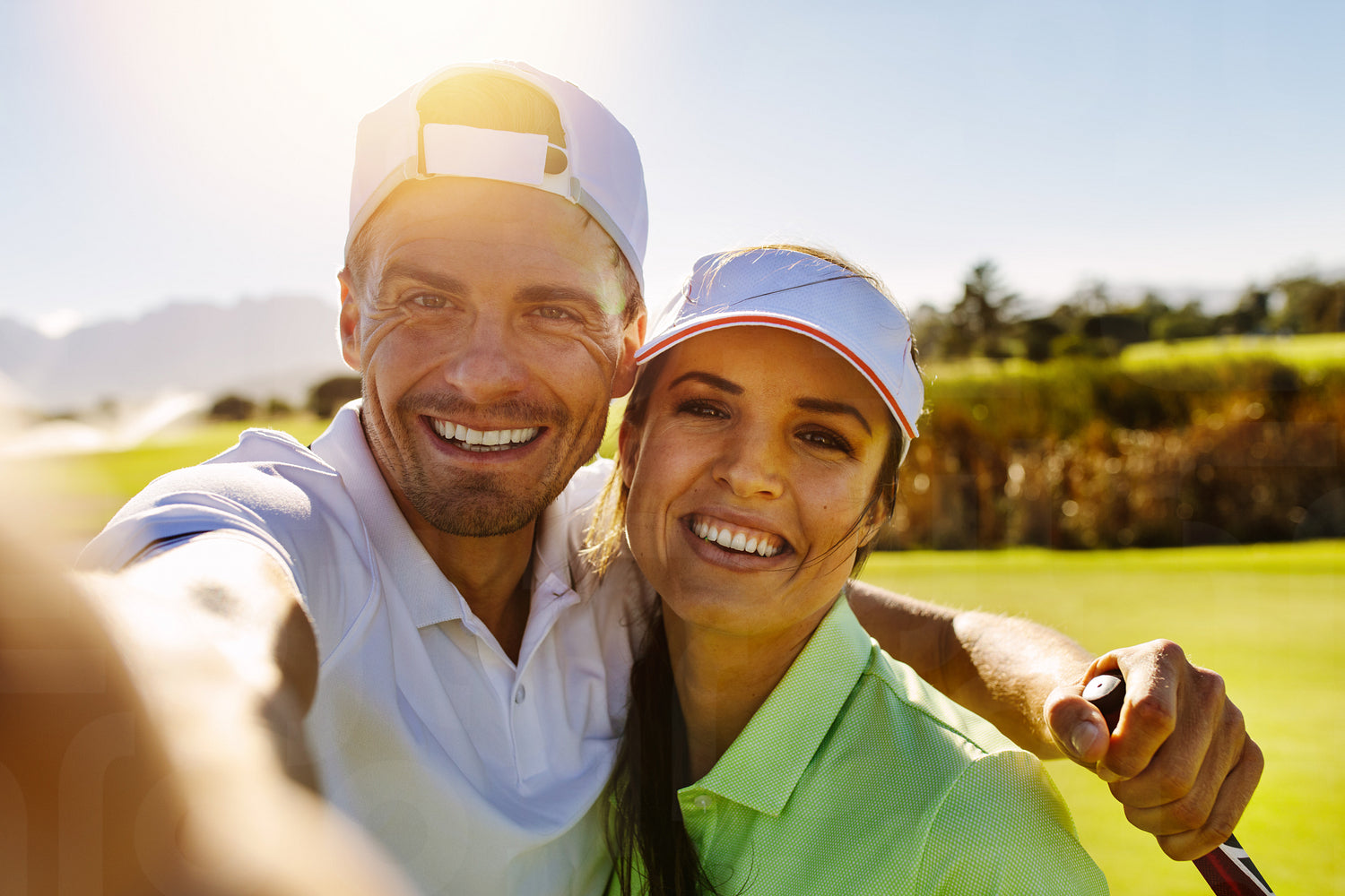 Smiling male and female golfers taking selfie at field on sunny day. Happy young couple taking self portrait at golf course.