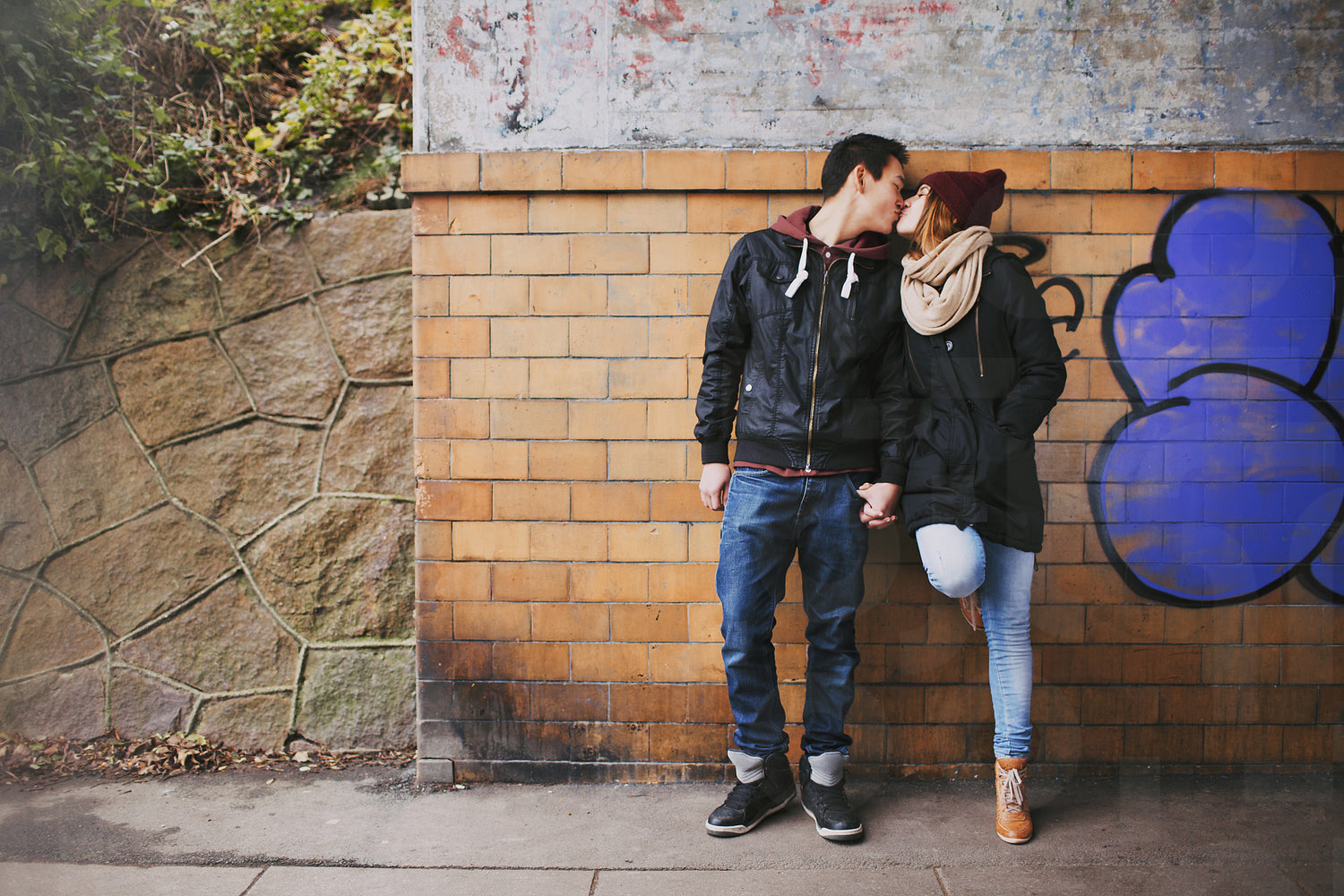 Affectionate teenage couple kissing outdoors against a wall on street. Mixed race couple in love.
