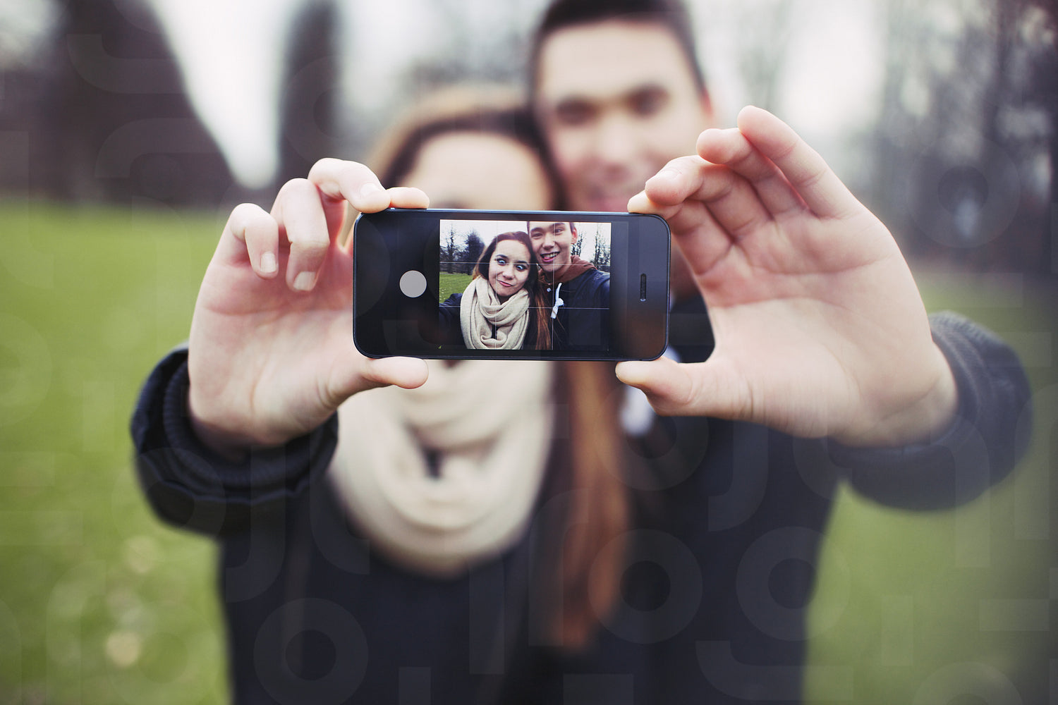Mixed race young boy and girl making a funny face while taking a self portrait with mobile phone. Cute young couple photographing themselves with smartphone.