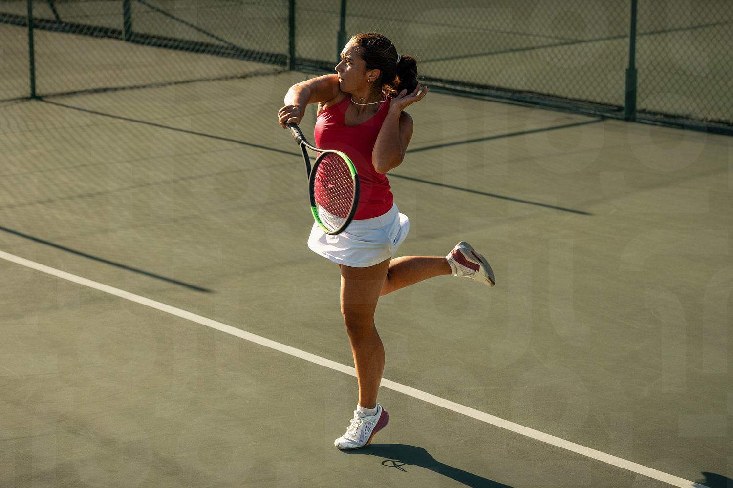 Competitive female tennis player in action hitting a powerful forehand shot during a game on an outdoor court