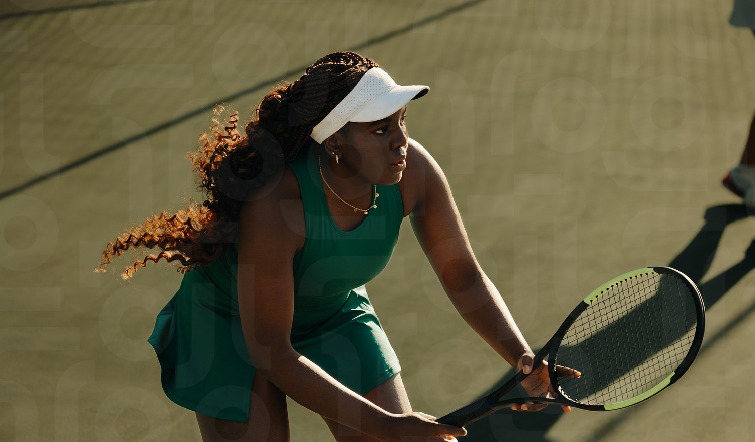 African-American woman actively playing tennis on a court, showcasing her athleticism and focus during the match.