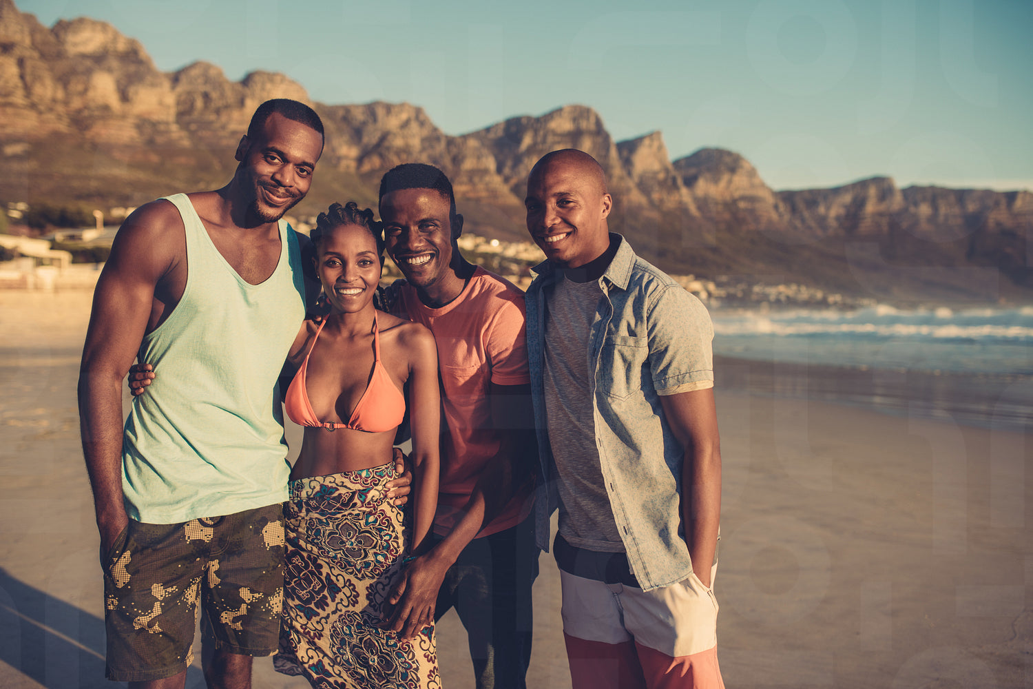 Group of four friends looking at camera and smiling. Young people standing together at beach.