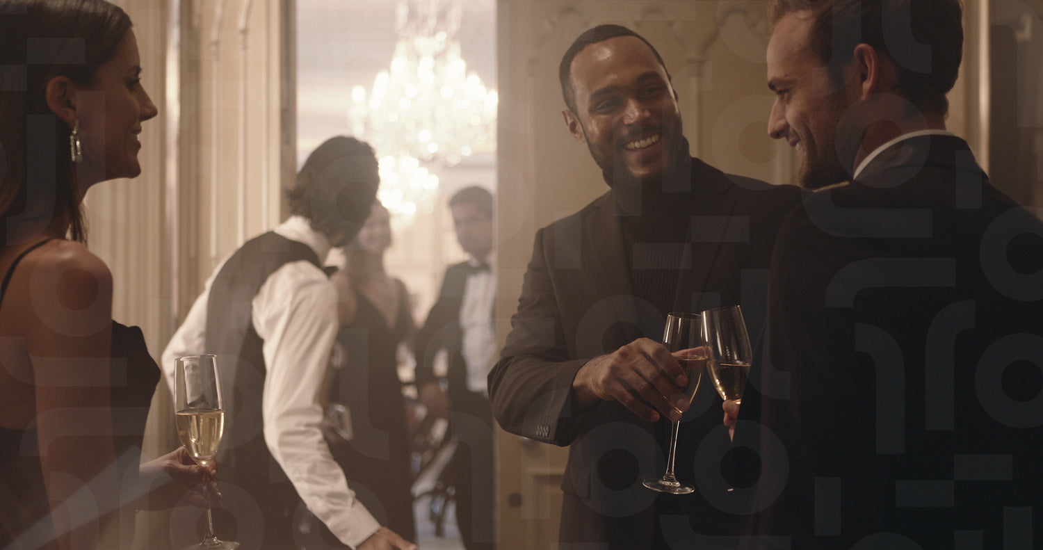 Friends toasting champagne glasses while a couple arriving hand in hand at party. Couple arriving at a party meeting and greeting their friends.