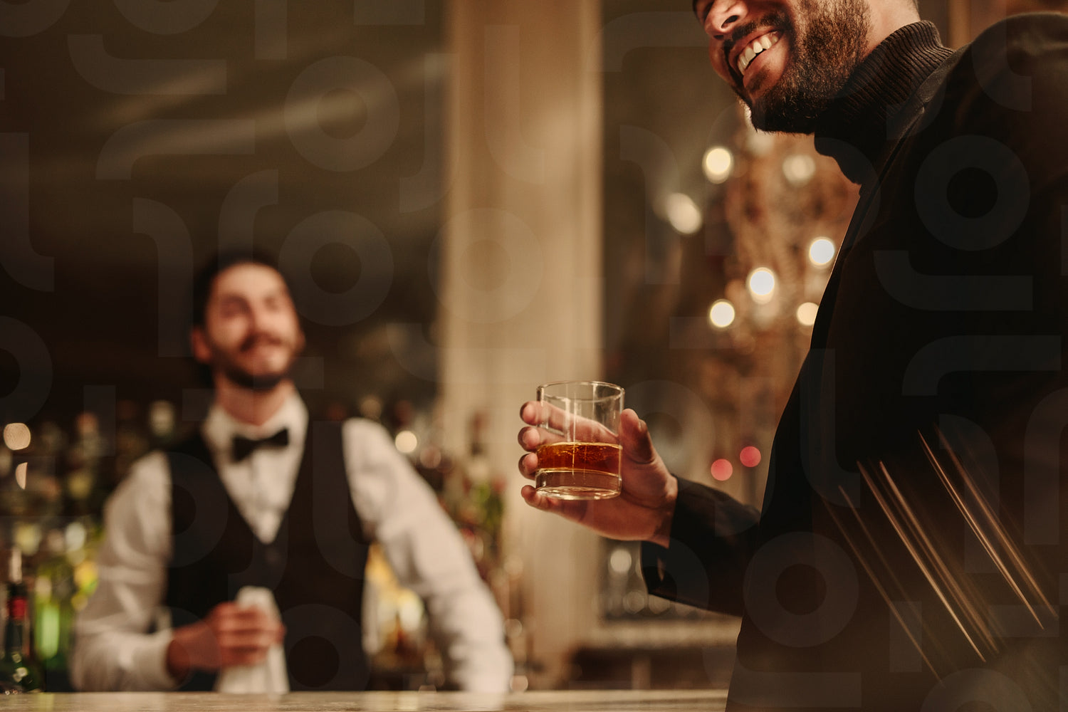 Closeup of man standing at bar with a drink. Man having a whiskey at bar with bartender in background.