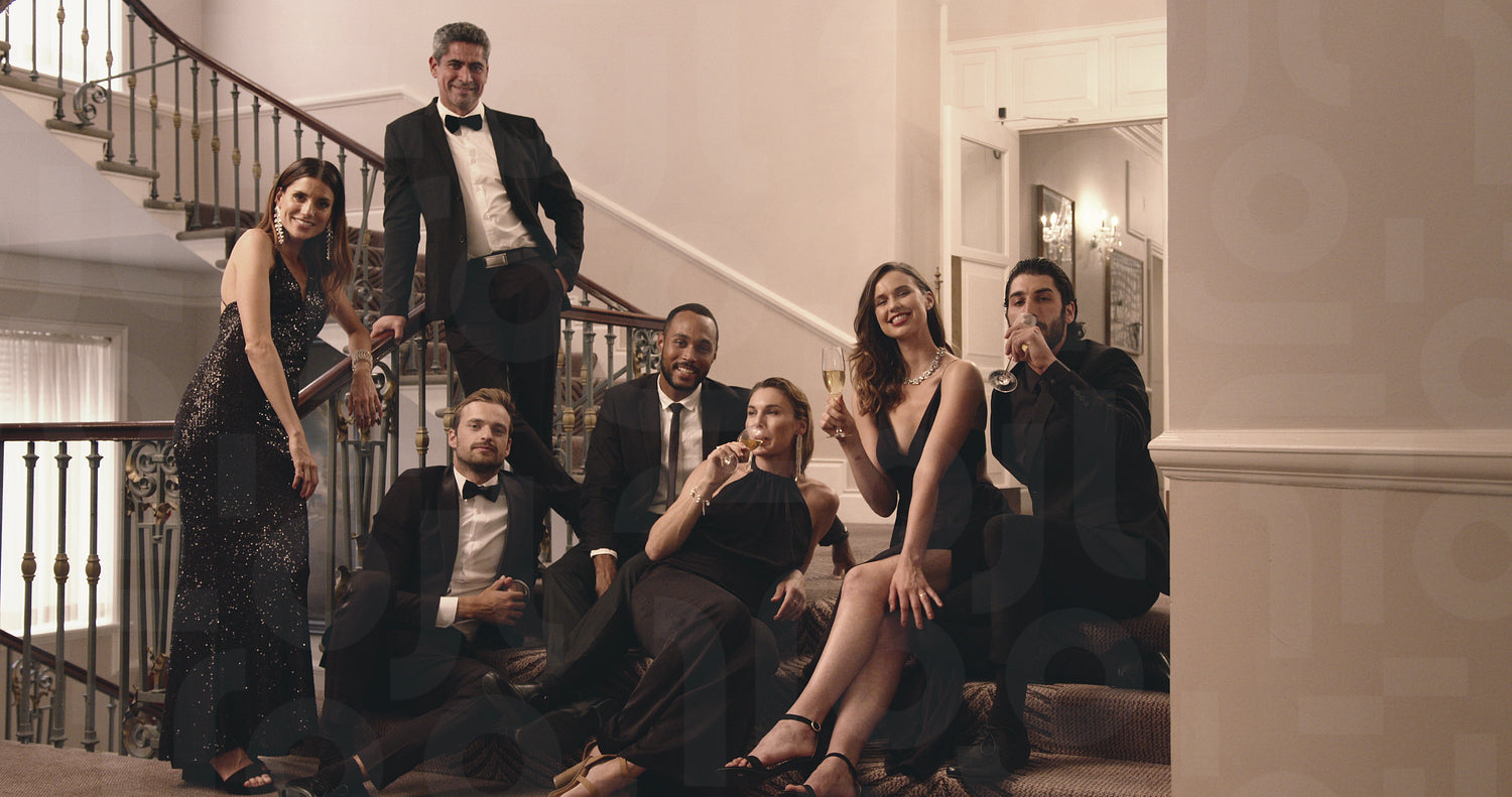 Group of men and woman sitting at stairs and looking at camera. Multi-ethnic friends enjoying at gala night.