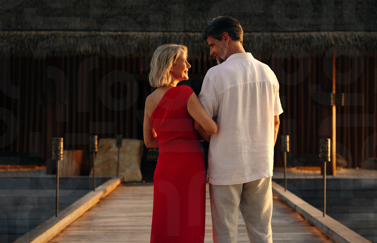A mature romantic couple standing closely on a wooden bridge in warm sunset light. They share an intimate moment at what appears to be a tropical resort, surrounded by a peaceful atmosphere.