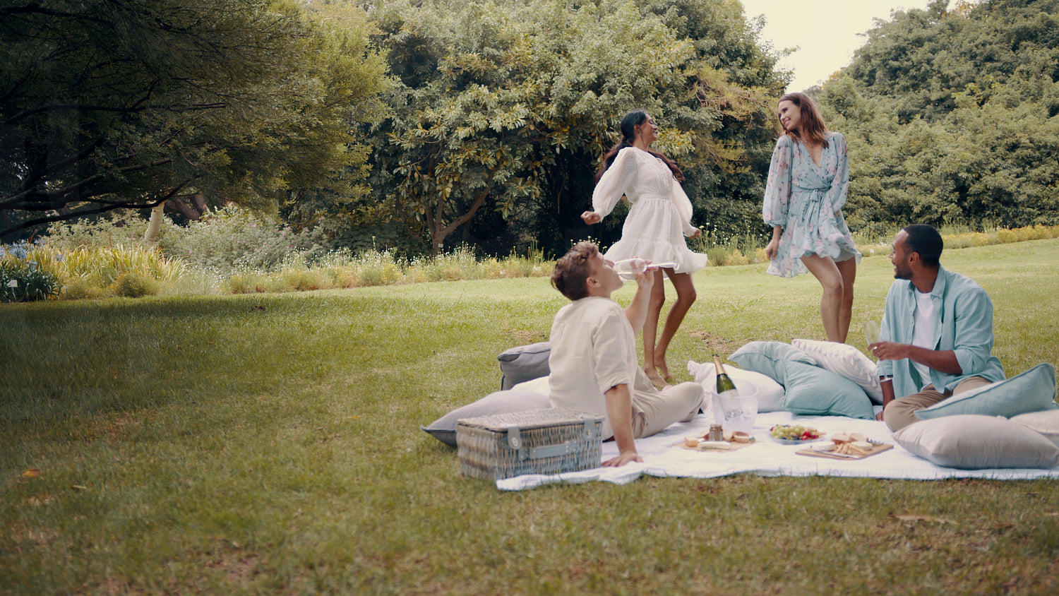 Group of friends having a great time on picnic. Group of men and women dancing together at the park.