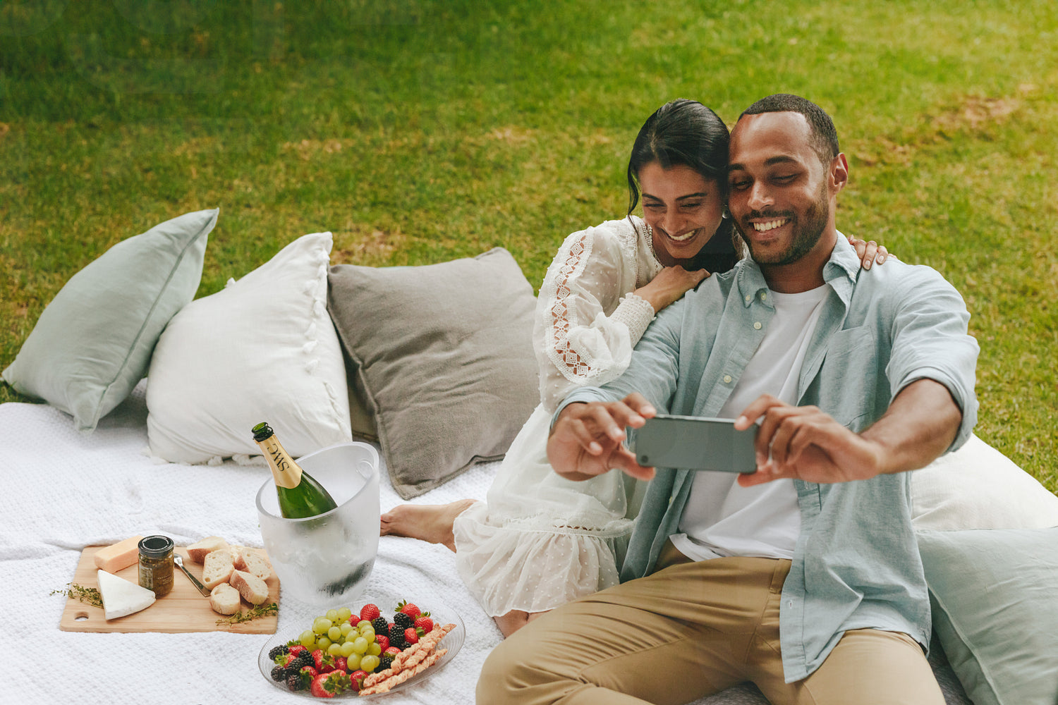 Loving couple taking selfie on picnic