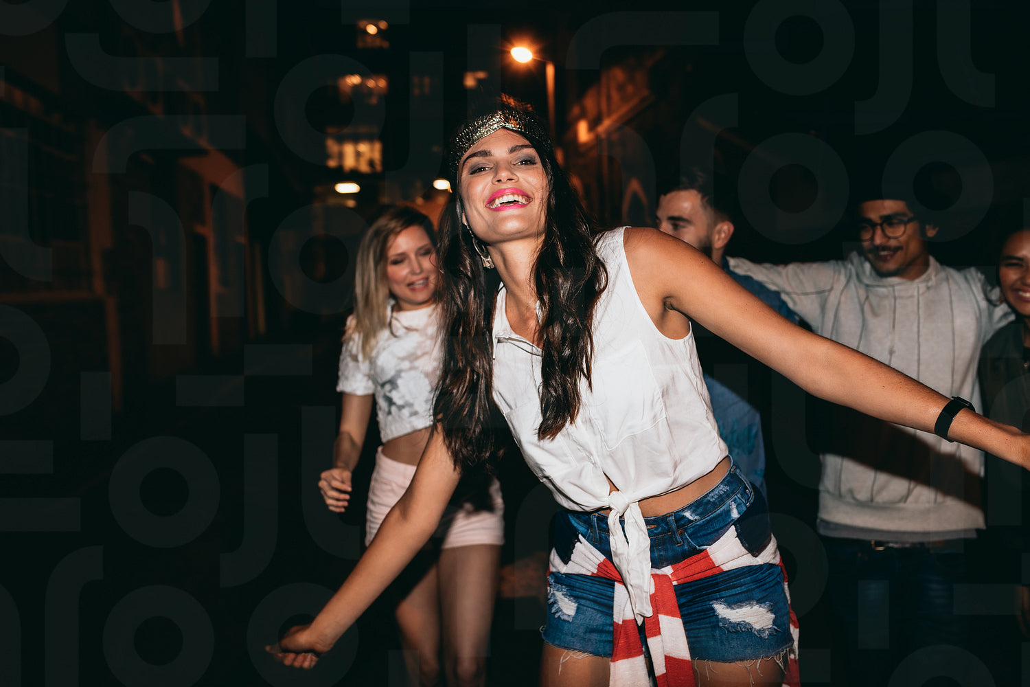 Portrait of beautiful young woman dancing with her friends in background. Happy young female in party with friends at night.