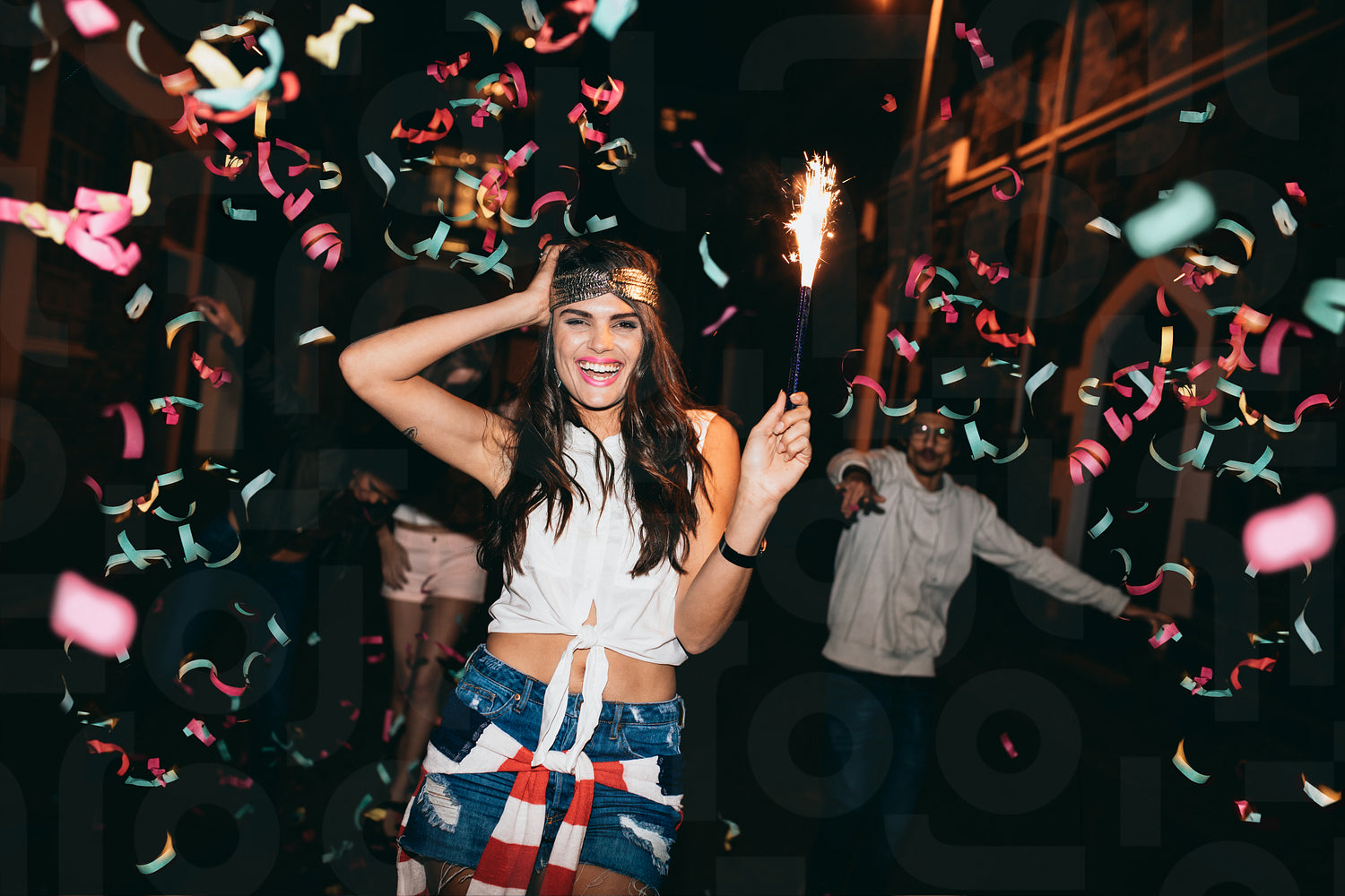 Happy young woman partying with her friends outdoors at night. Friends partying outdoors with confetti and sparklers.