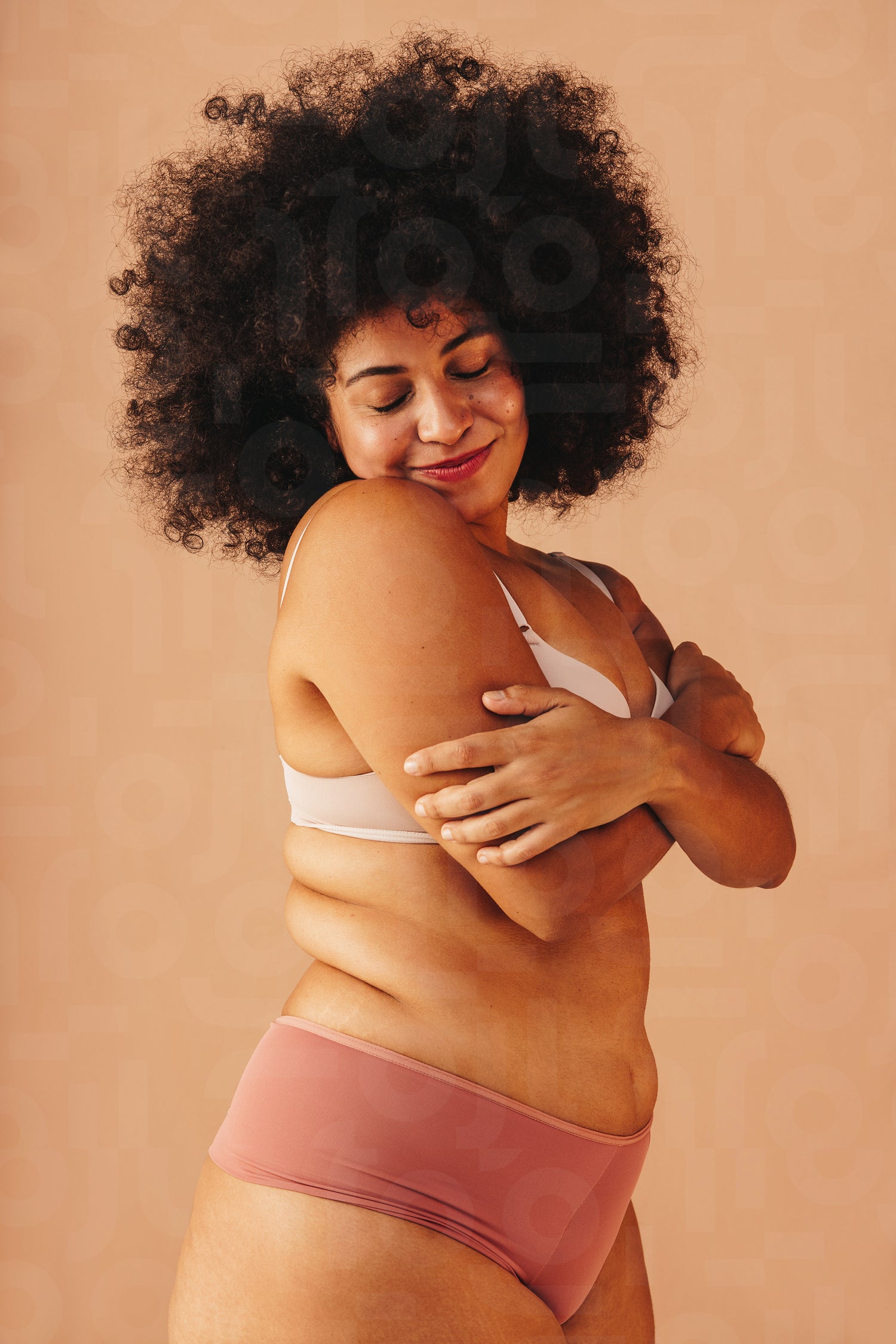 Body positive woman with an Afro hairstyle embracing herself while standing in a studio in underwear. Beautiful plus-size woman expressing love for her natural body and curly hair.