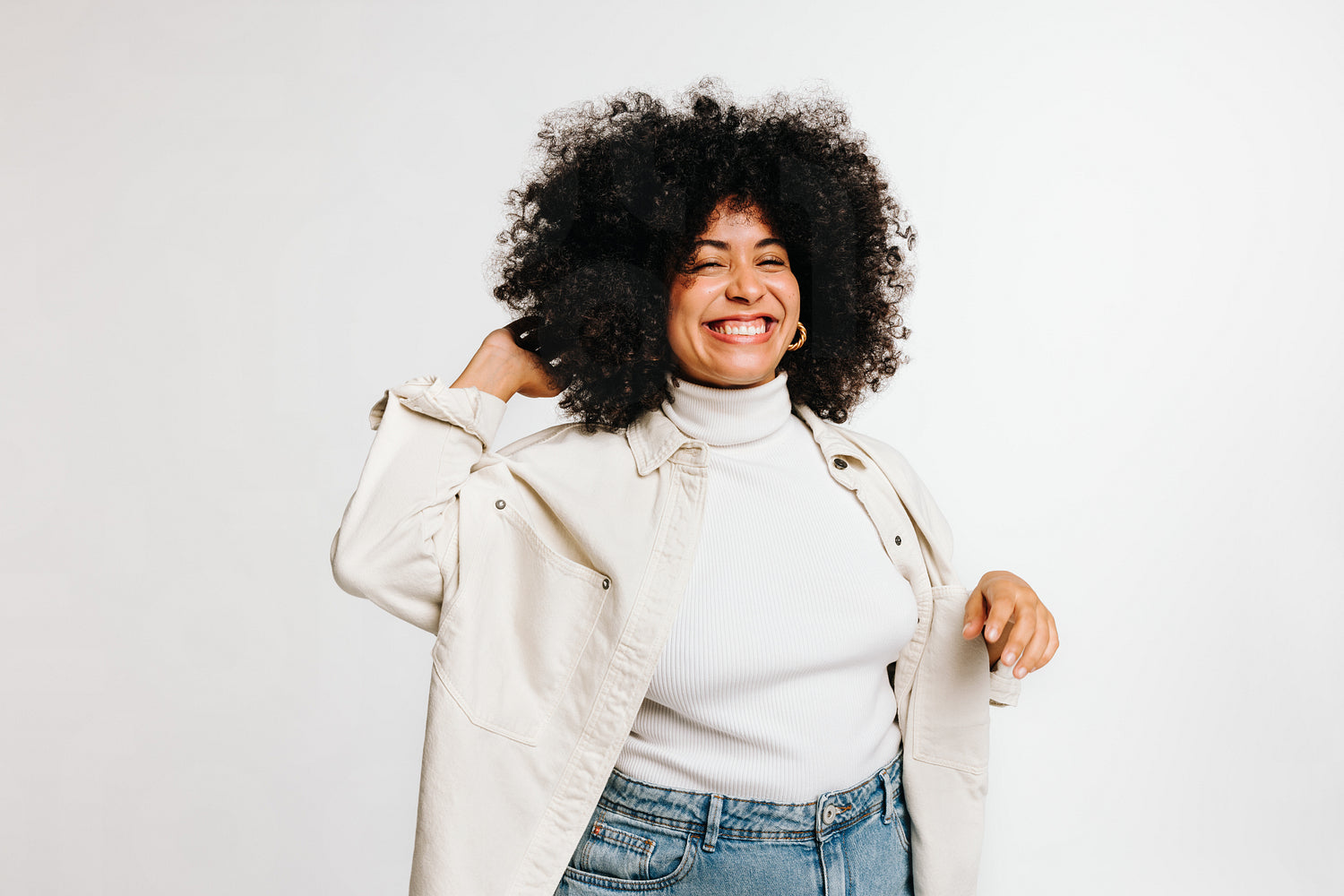 Curly and fabulous. Beautiful woman with an Afro hairstyle smiling and touching her hair while standing against a studio background. Happy woman of colour wearing her natural hair with pride.