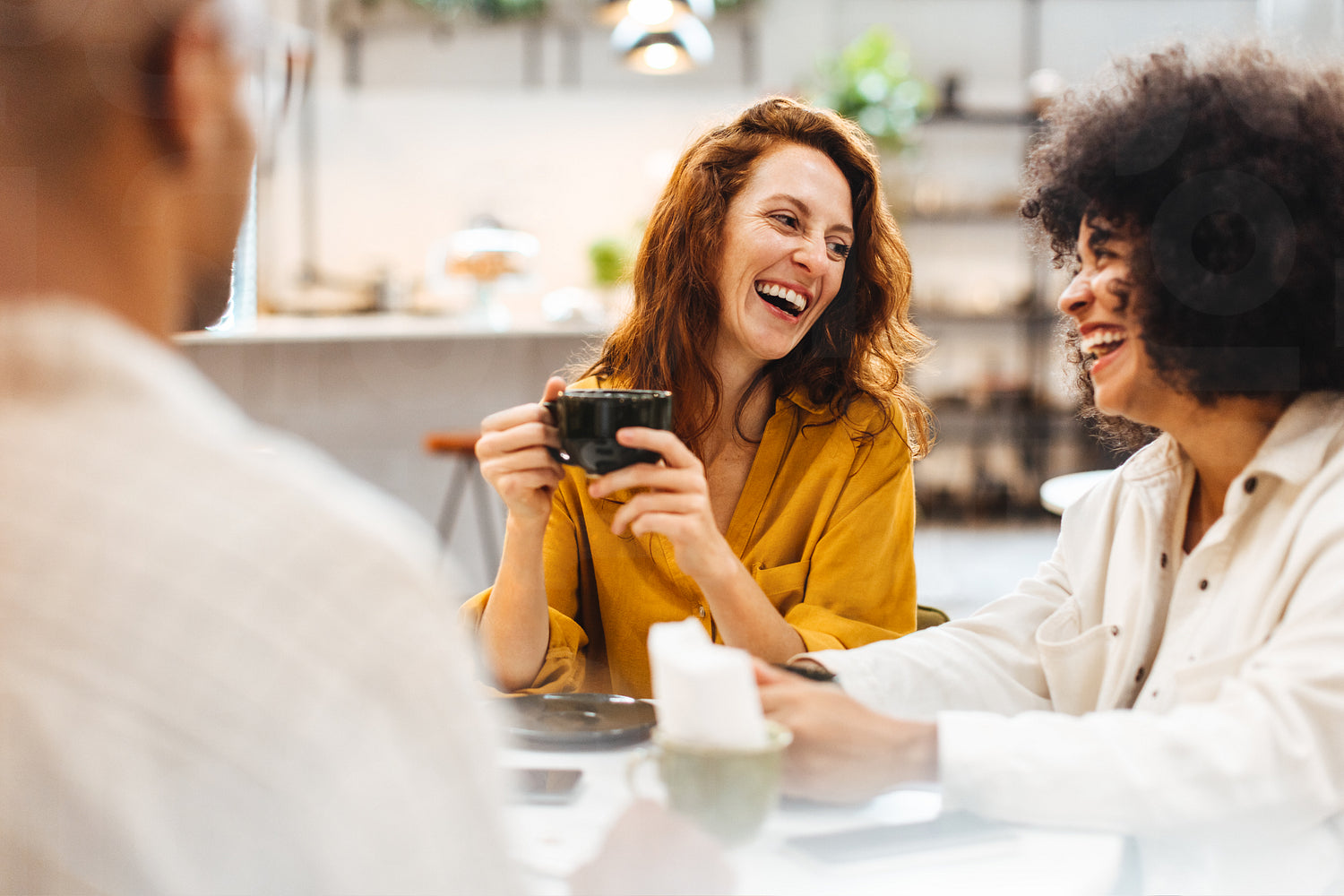 Friends smile happily as they hang out together in a restaurant, enjoying good coffee, good company, and a relaxing atmosphere. Group of young people chatting and socializing in a cafe.