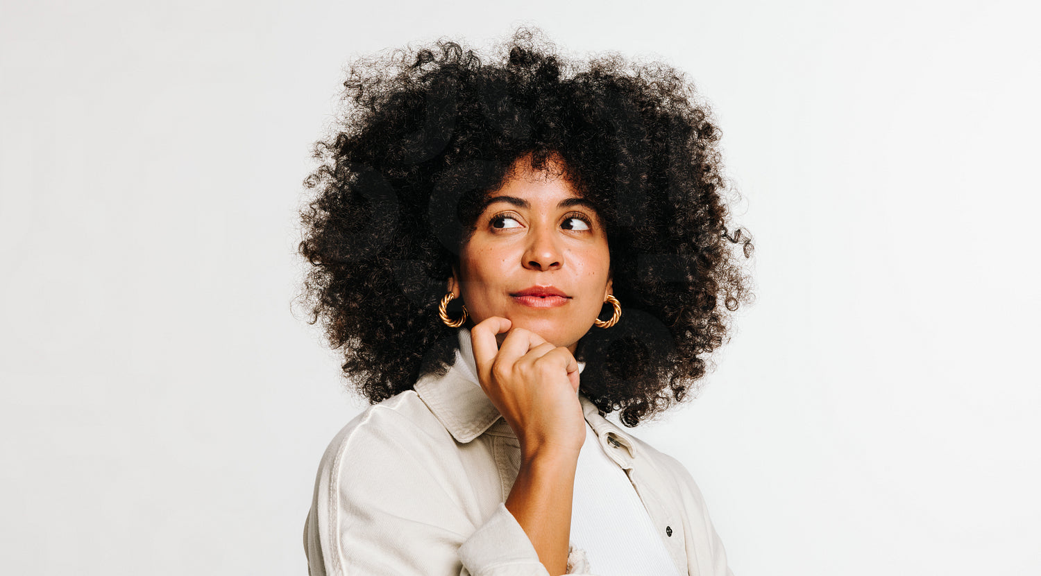 Young woman with curly hair looking away thoughtfully while standing against a white background. Gorgeous woman of colour wearing her natural hair with confidence.