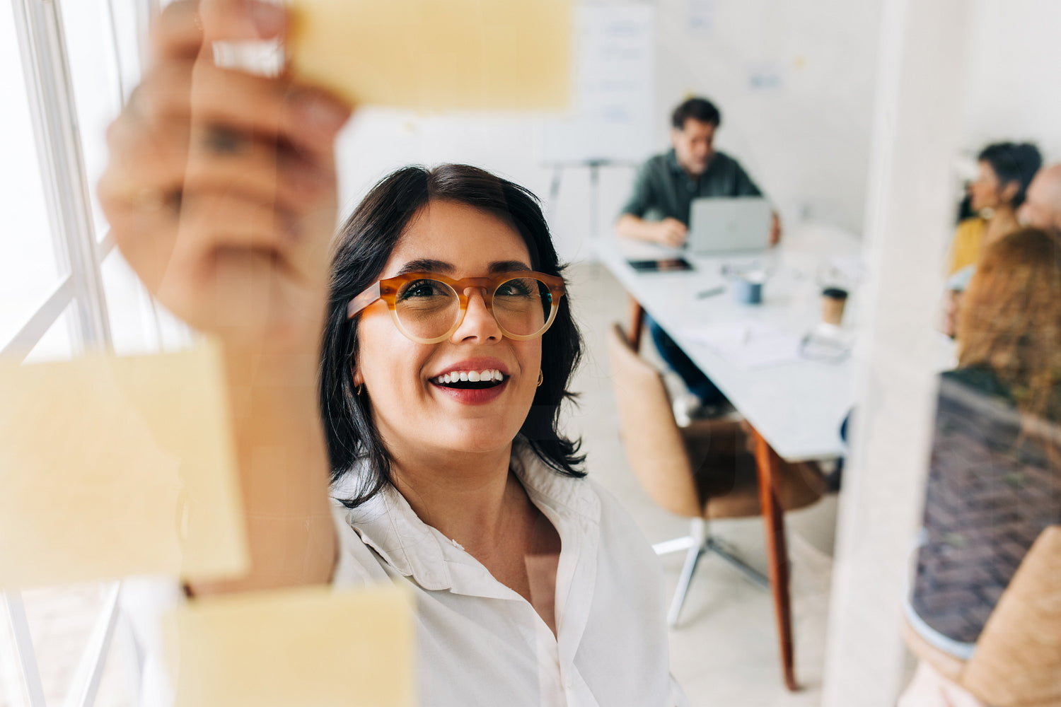 Business woman brainstorming with sticky notes in an office. Creative business woman putting her ideas on a glass wall. Female professional working on a business strategy in a marketing agency.