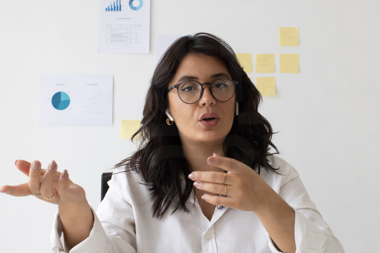 Business woman talking to her team on a video call. Female professional taking part in a discussion during a video conference. Woman connecting with her colleagues online.