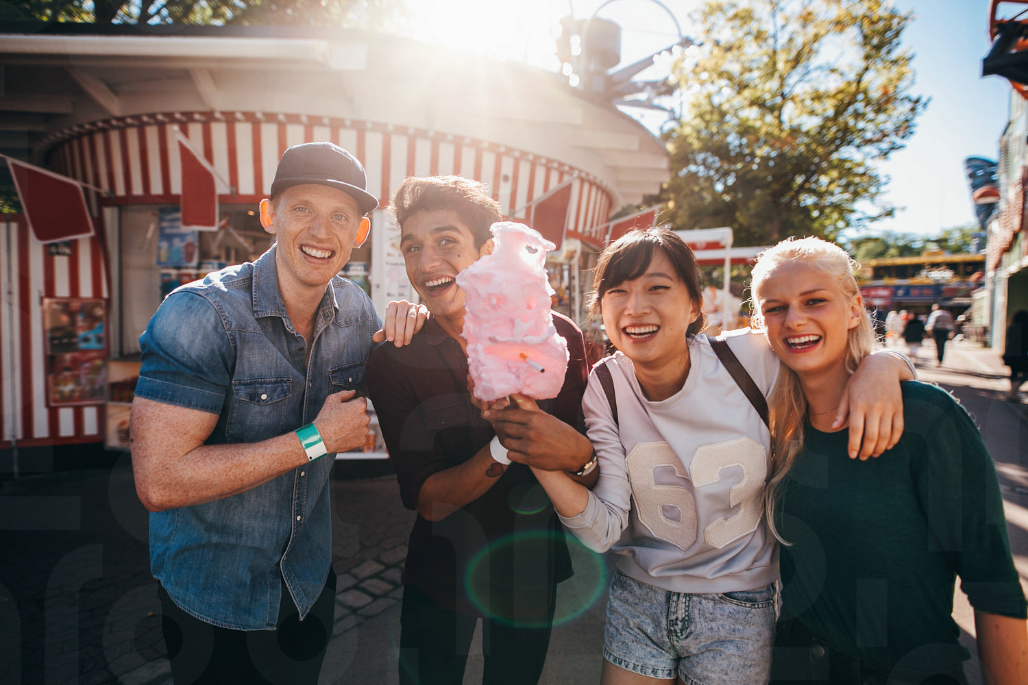 Group of happy young friends with cotton candy in amusement park. Young men and women holding cotton candyfloss and smiling.