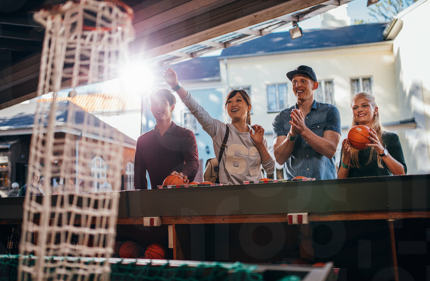 Happy young friends shooting hoops at amusement park and having fun. Group of friends playing basketball game at the fair.