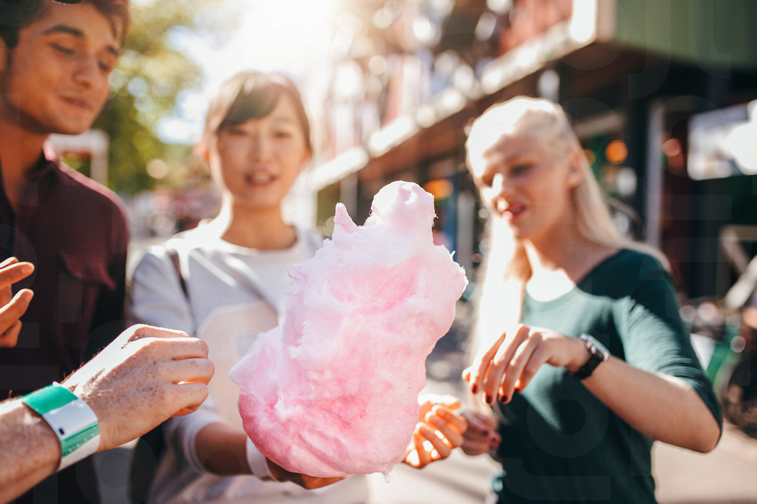 Three young people sharing cotton candyfloss at amusement park. Group of friends eating cotton candy together outdoors.