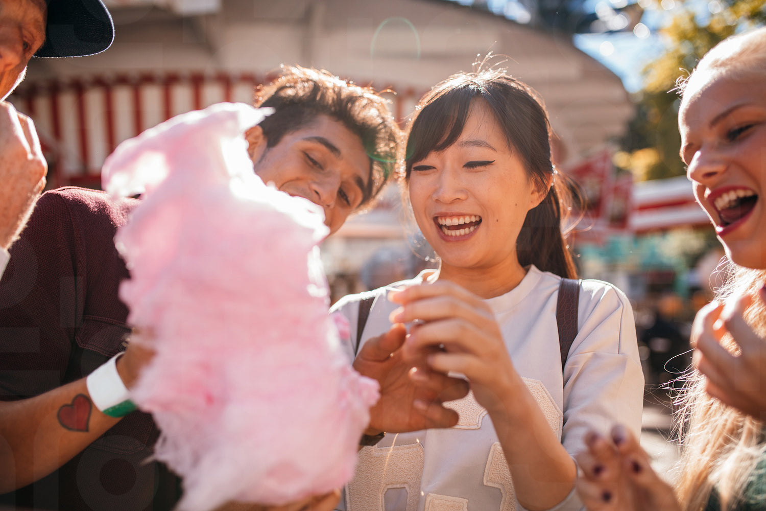 Group of friends eating candyfloss at amusement park. Smiling young people sharing cotton candy outdoors.