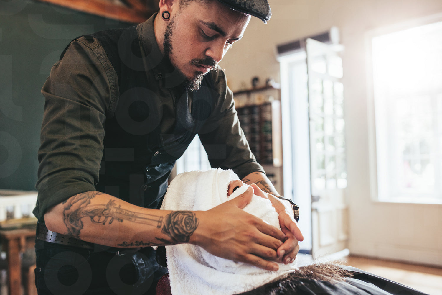 Hipster barber applies a warm cloth on face of male client. Hairdresser covering face of male client with towel.