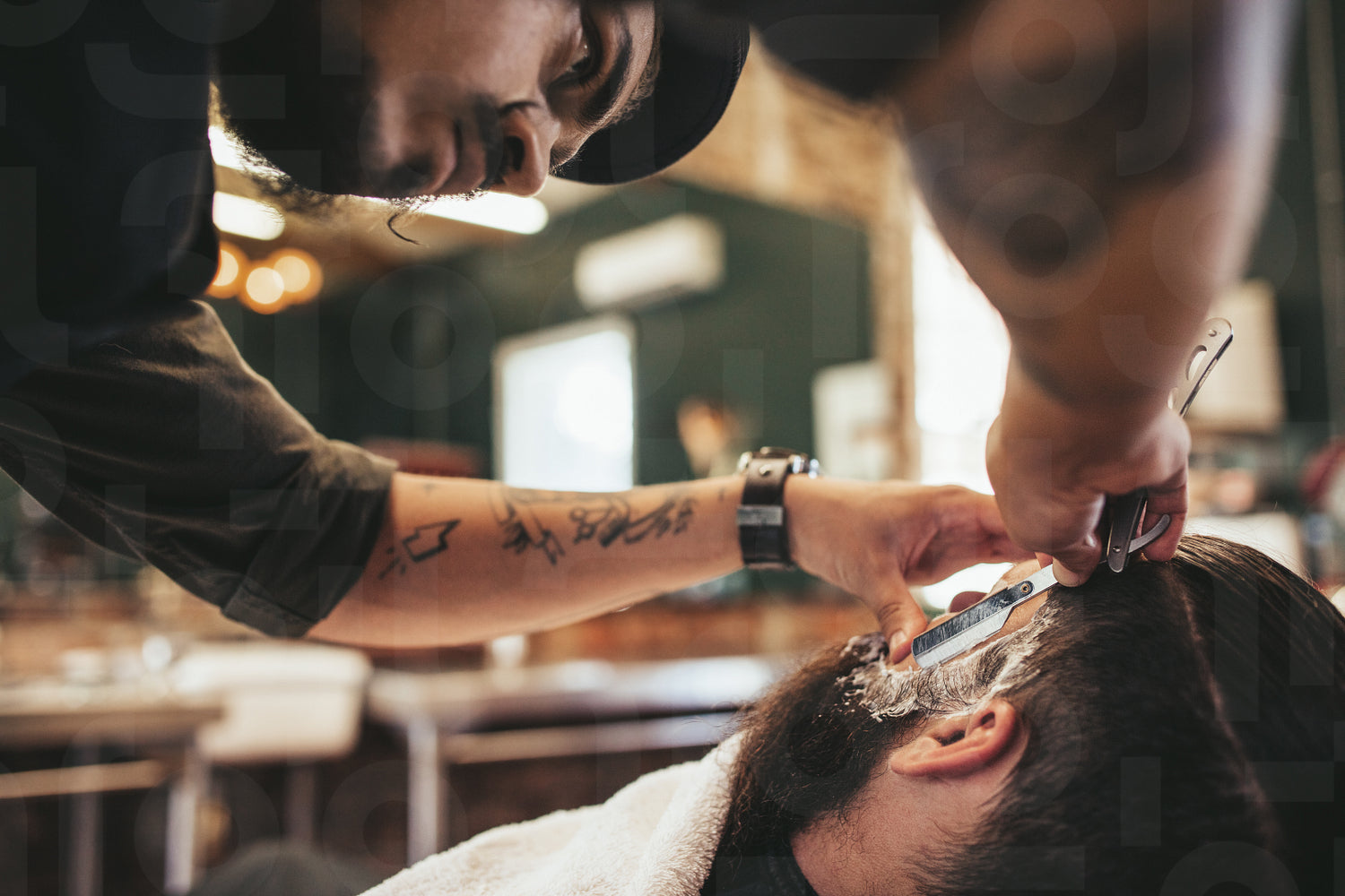 Professional hairdresser shaving customer with straight razor. Barber shaving bearded man.