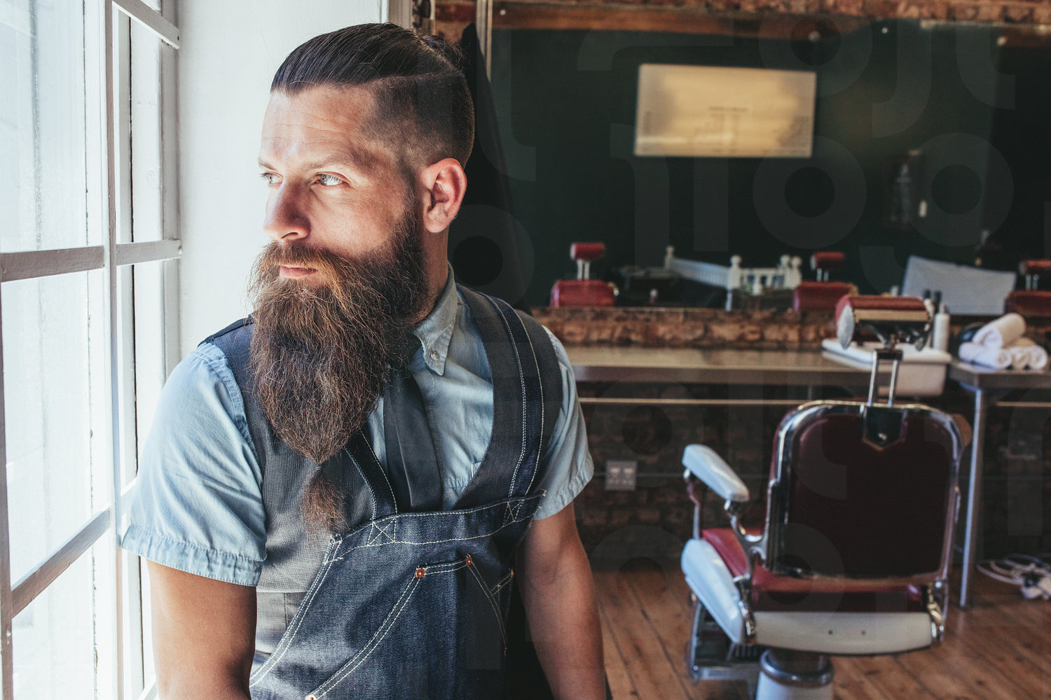 Portrait of barber with apron standing by window and looking away. Male hairdresser looking outside window and thinking.