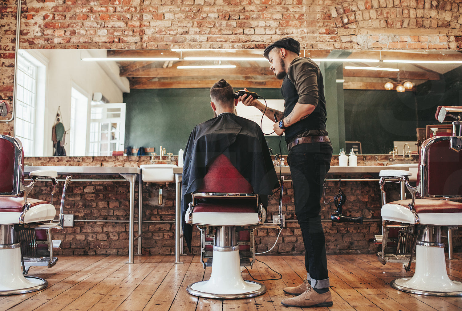 Rear view shot of handsome hairdresser cutting hair of male client. Hairstylist serving client at barber shop.