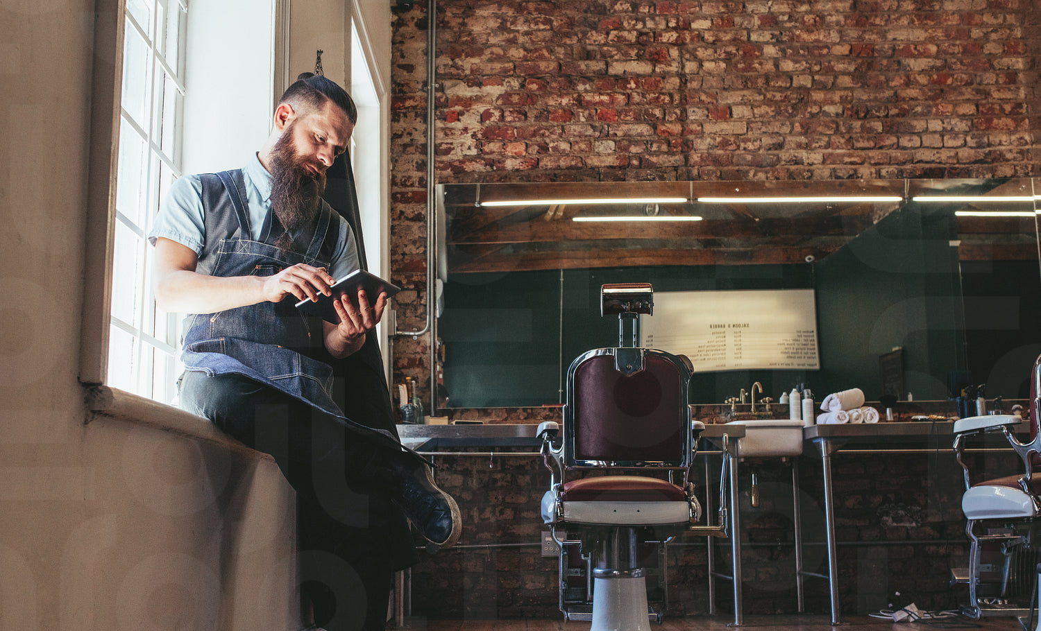 Hairstylist using digital tablet at his shop. Hairdresser sitting at barber shop working on digital tablet.