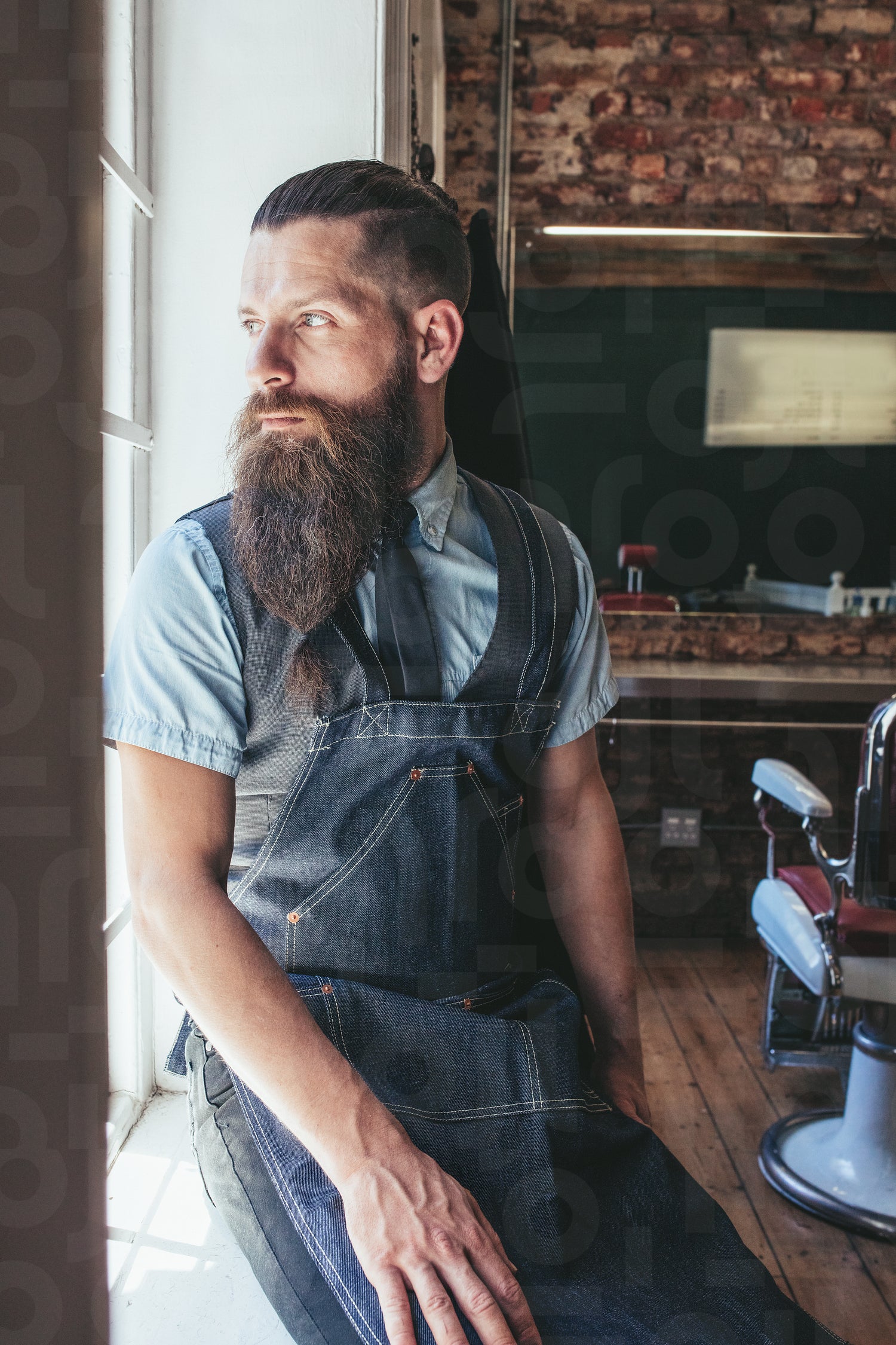 Serious male barber with long beard looking outside the window. Hairdresser sitting on window sill in salon and thinking.